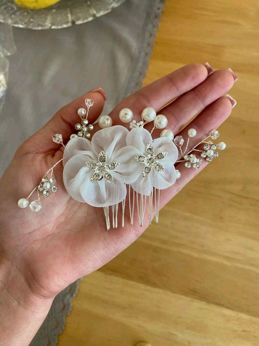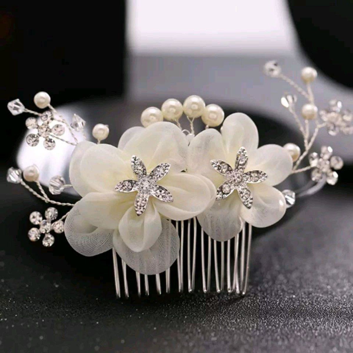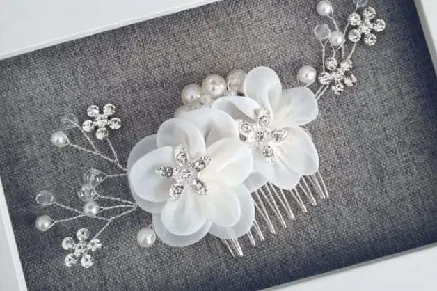 Hermosa peineta con diseño de flor de tela blanca