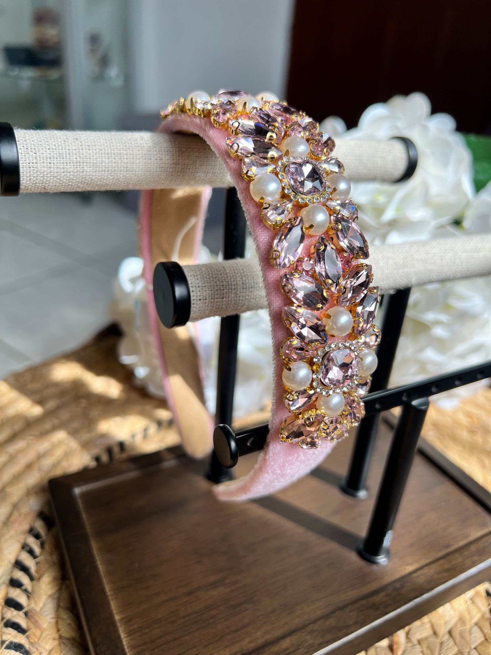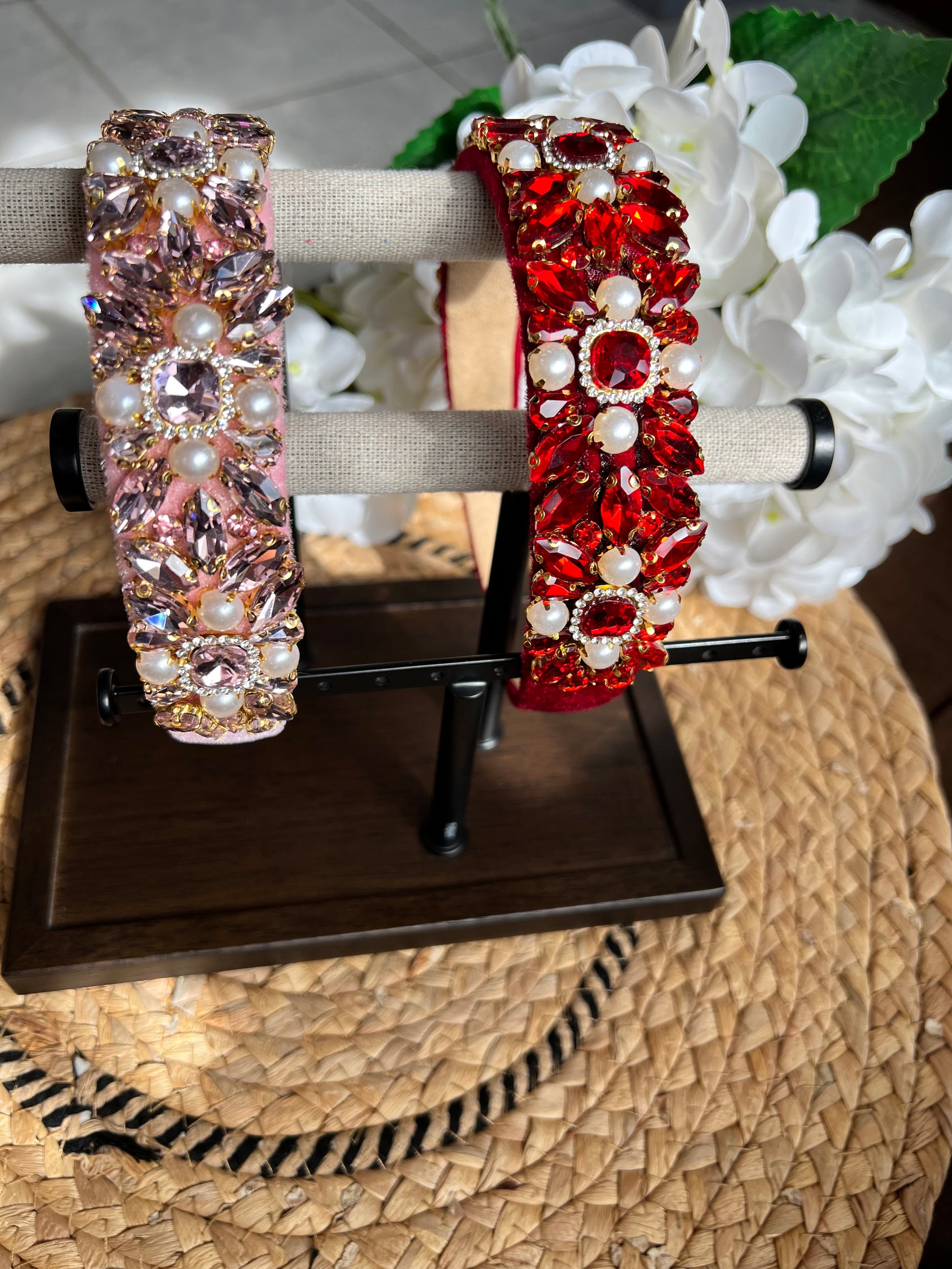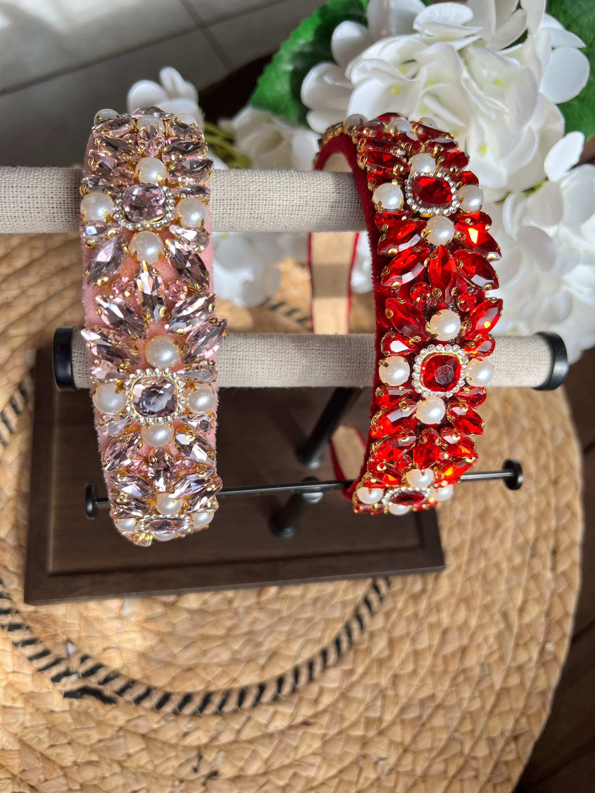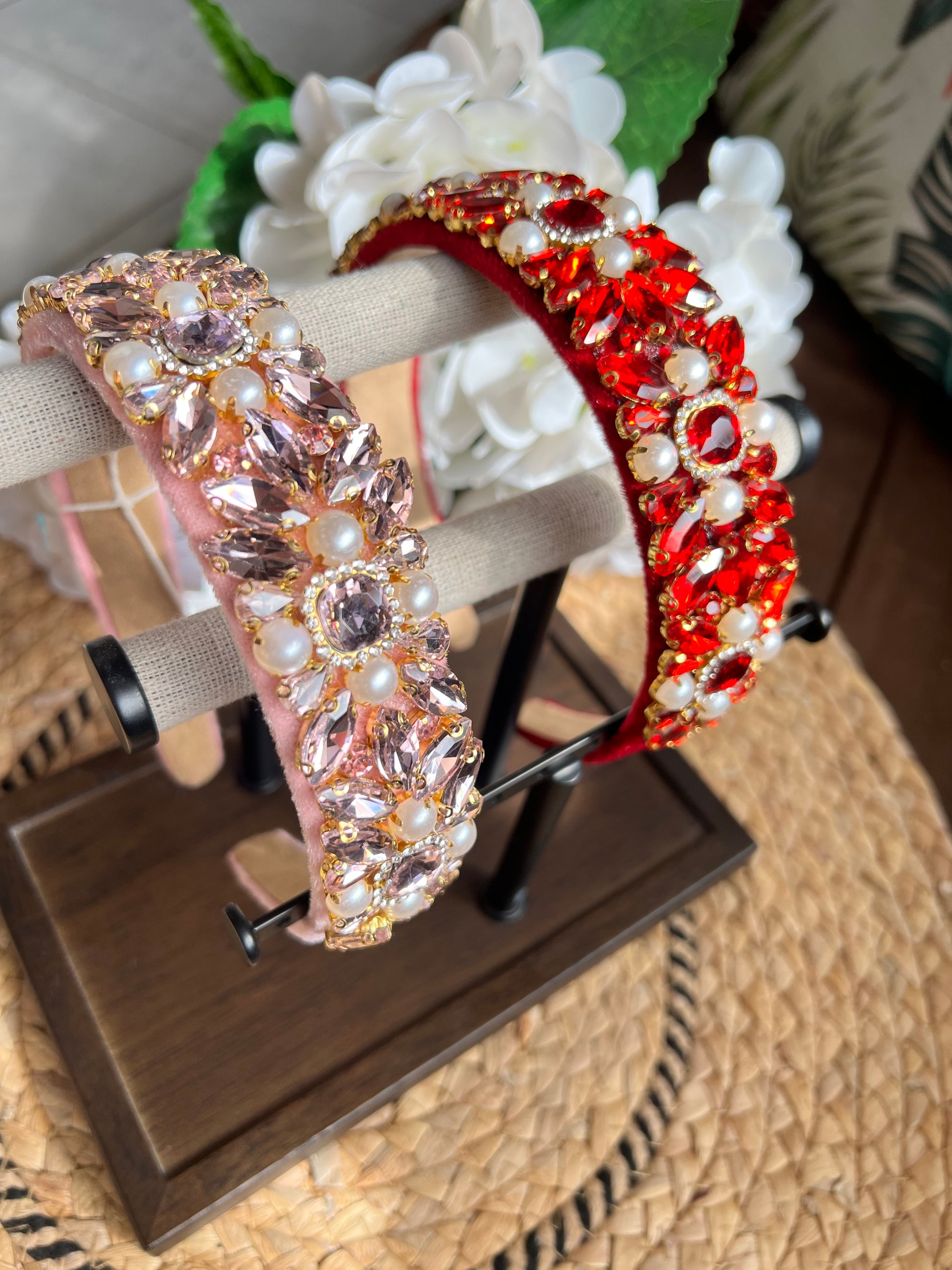 Diadema en terciopelo con perlas y piedras en rojo y rosado