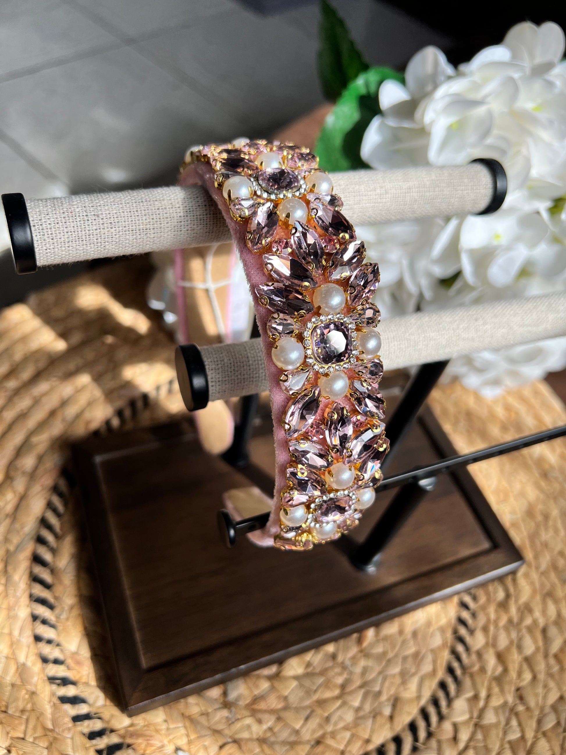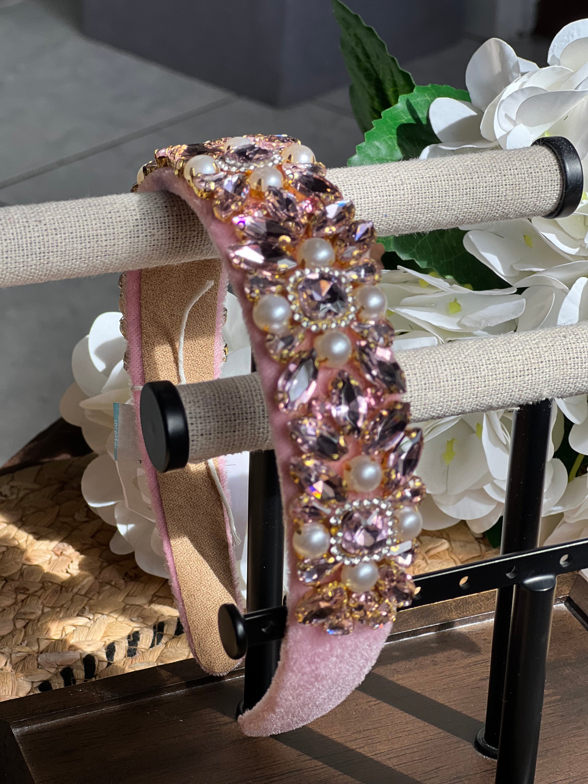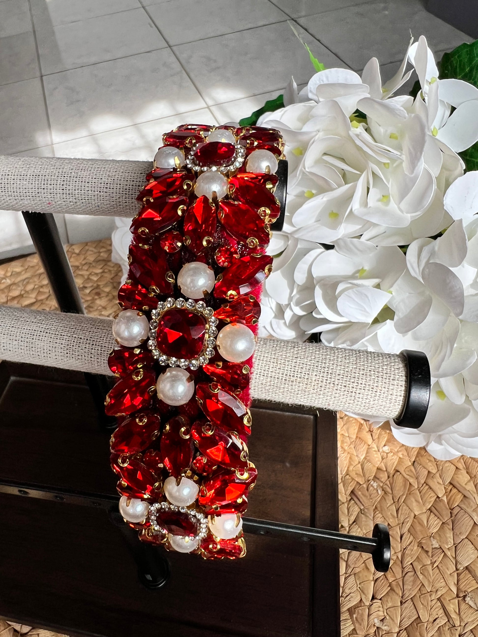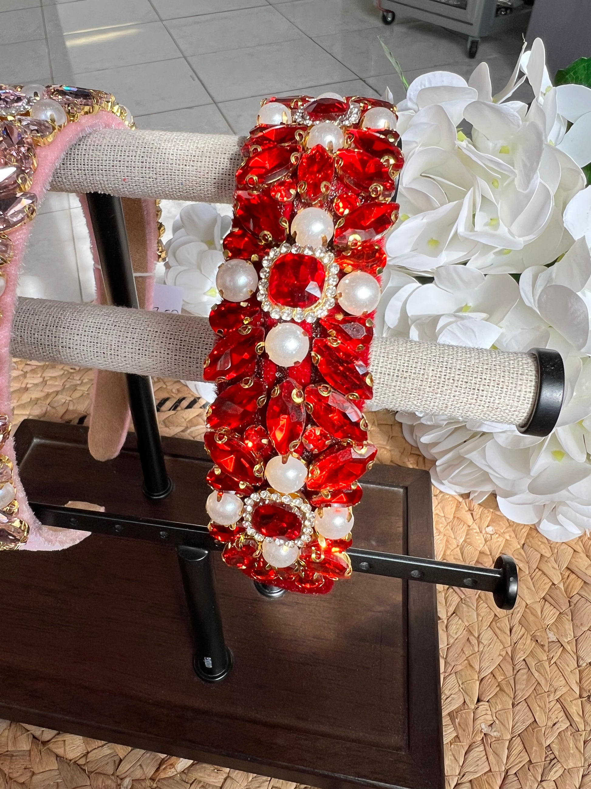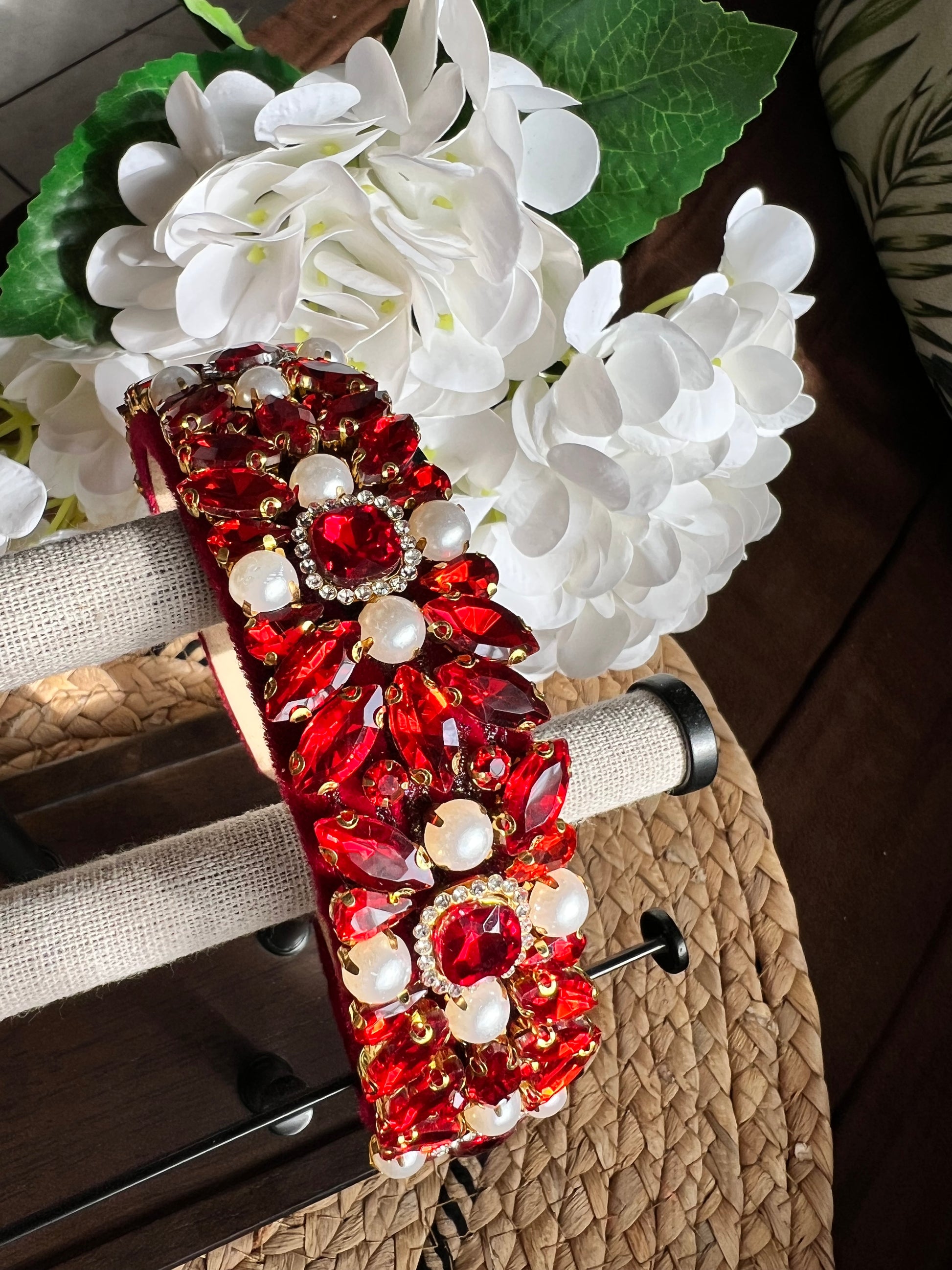 Diadema en terciopelo con perlas y piedras en rojo y rosado