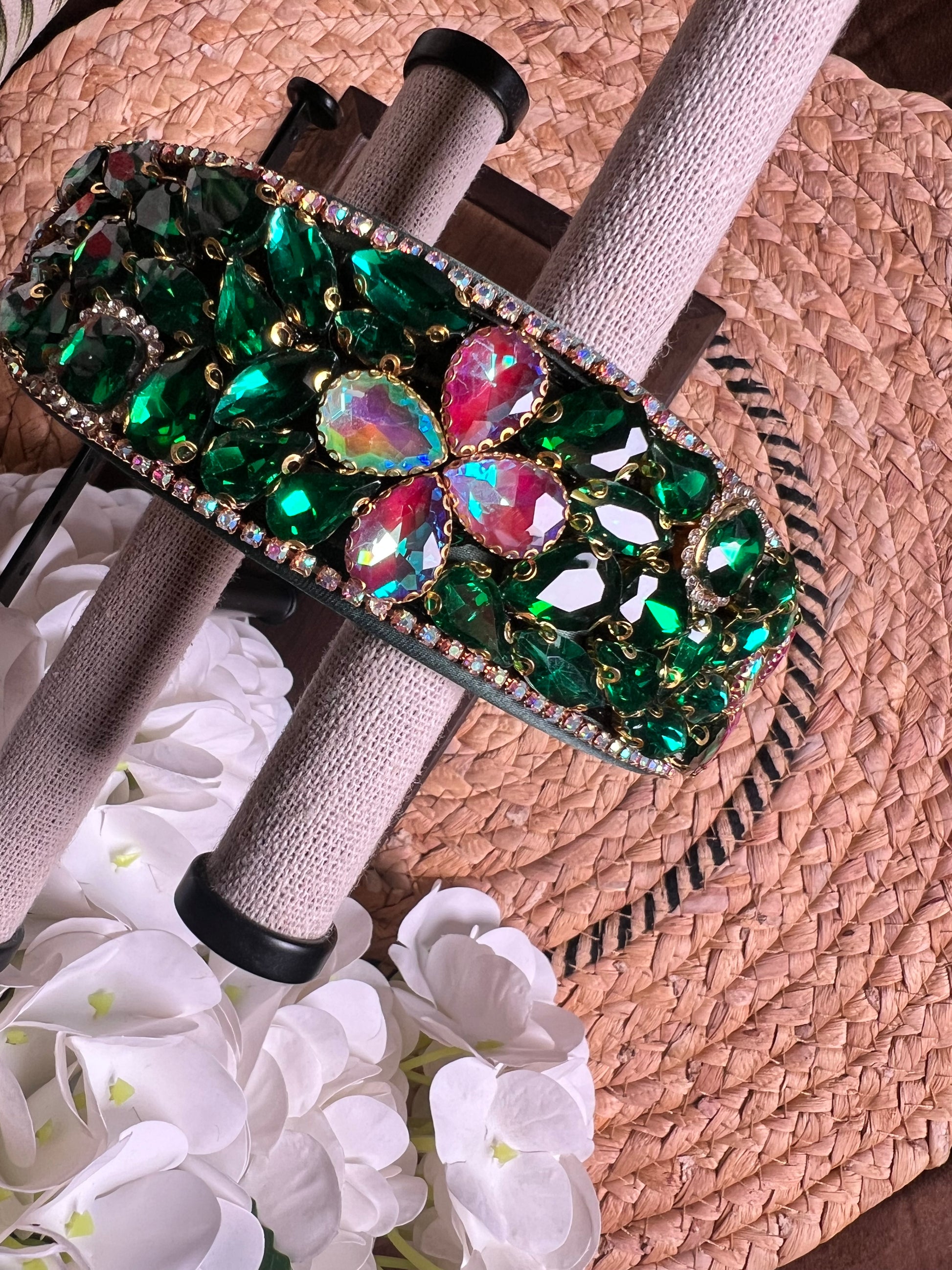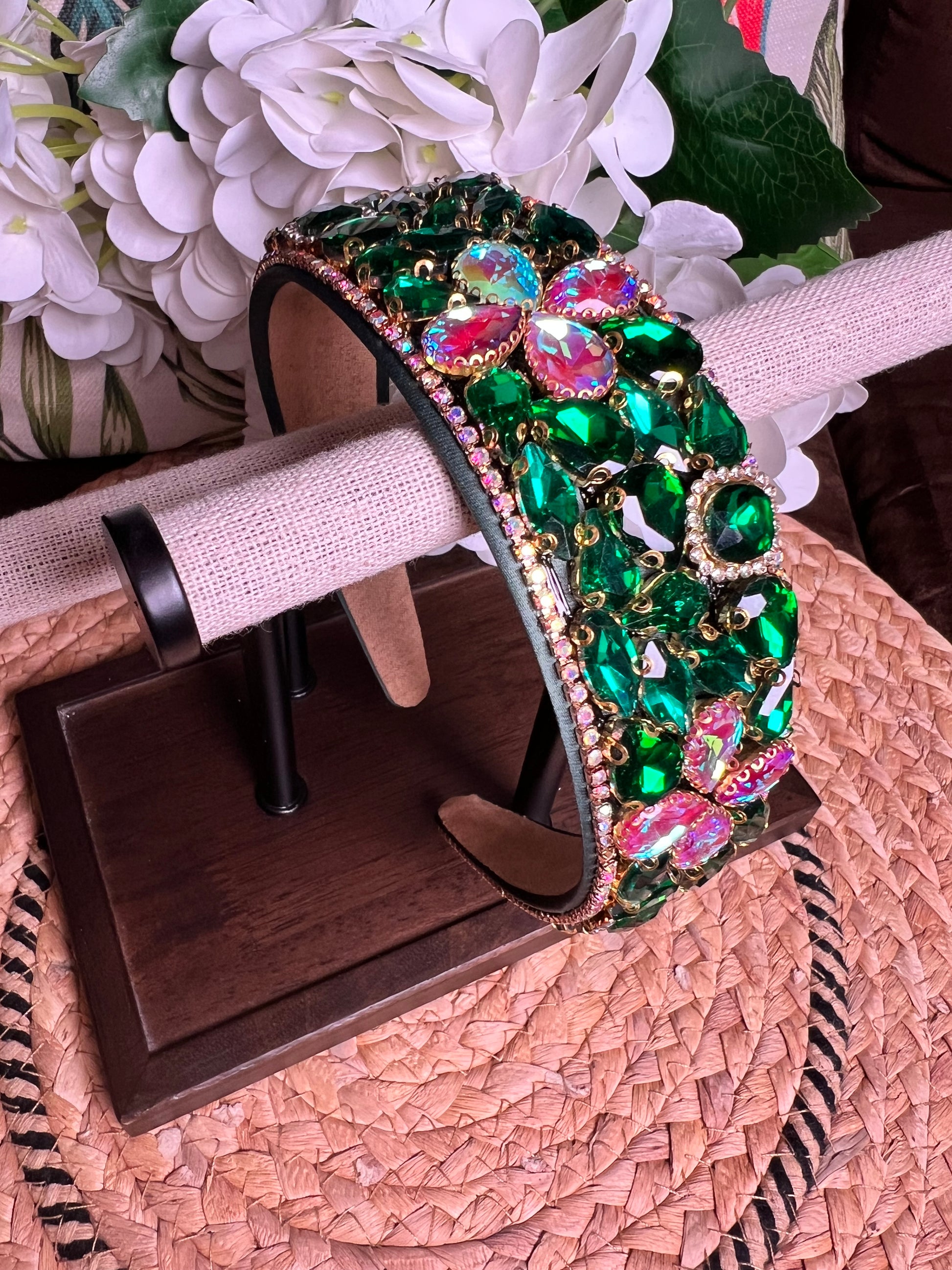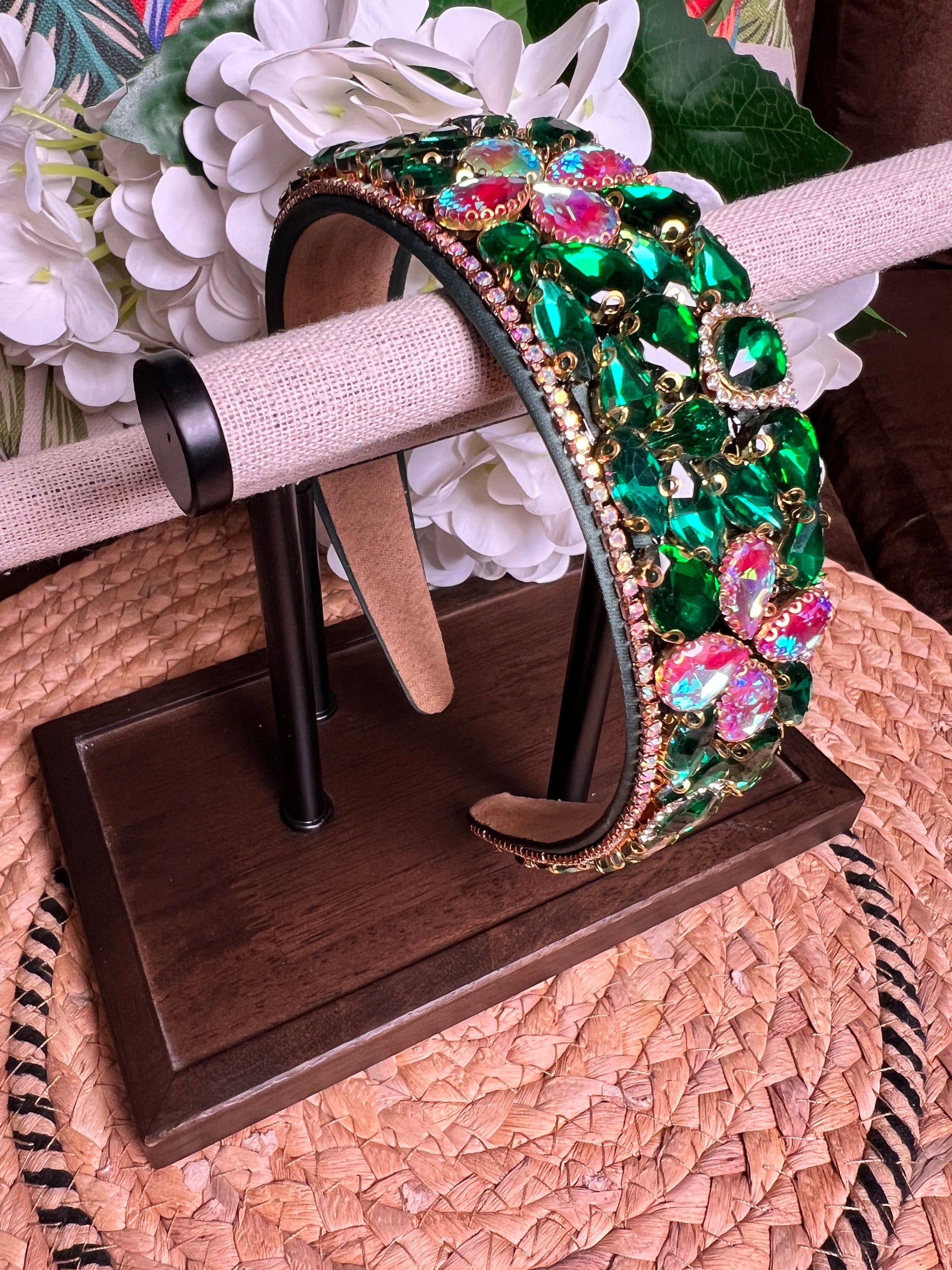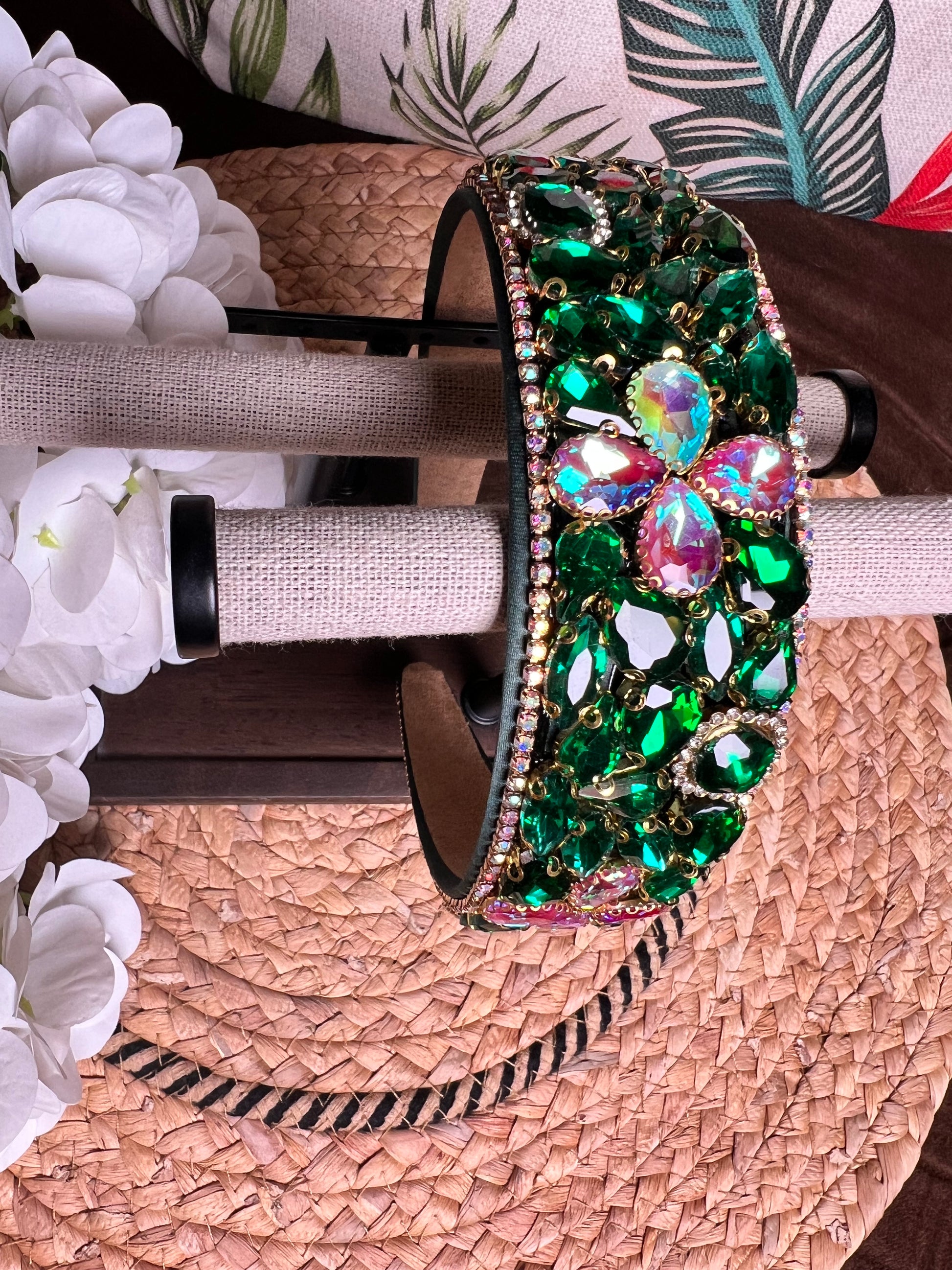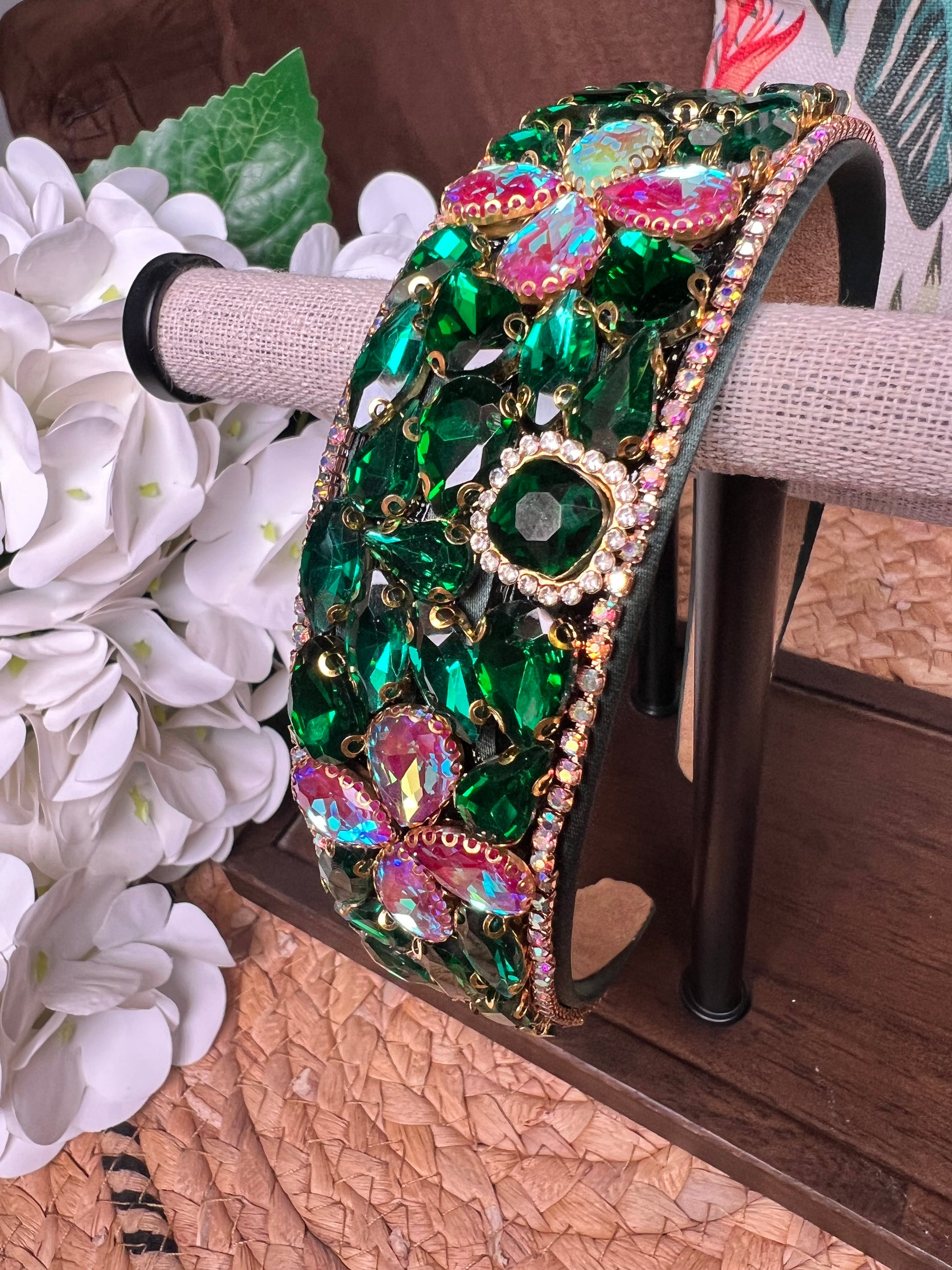 Diadema con gemas rosas en forma de flor en verde y dorado