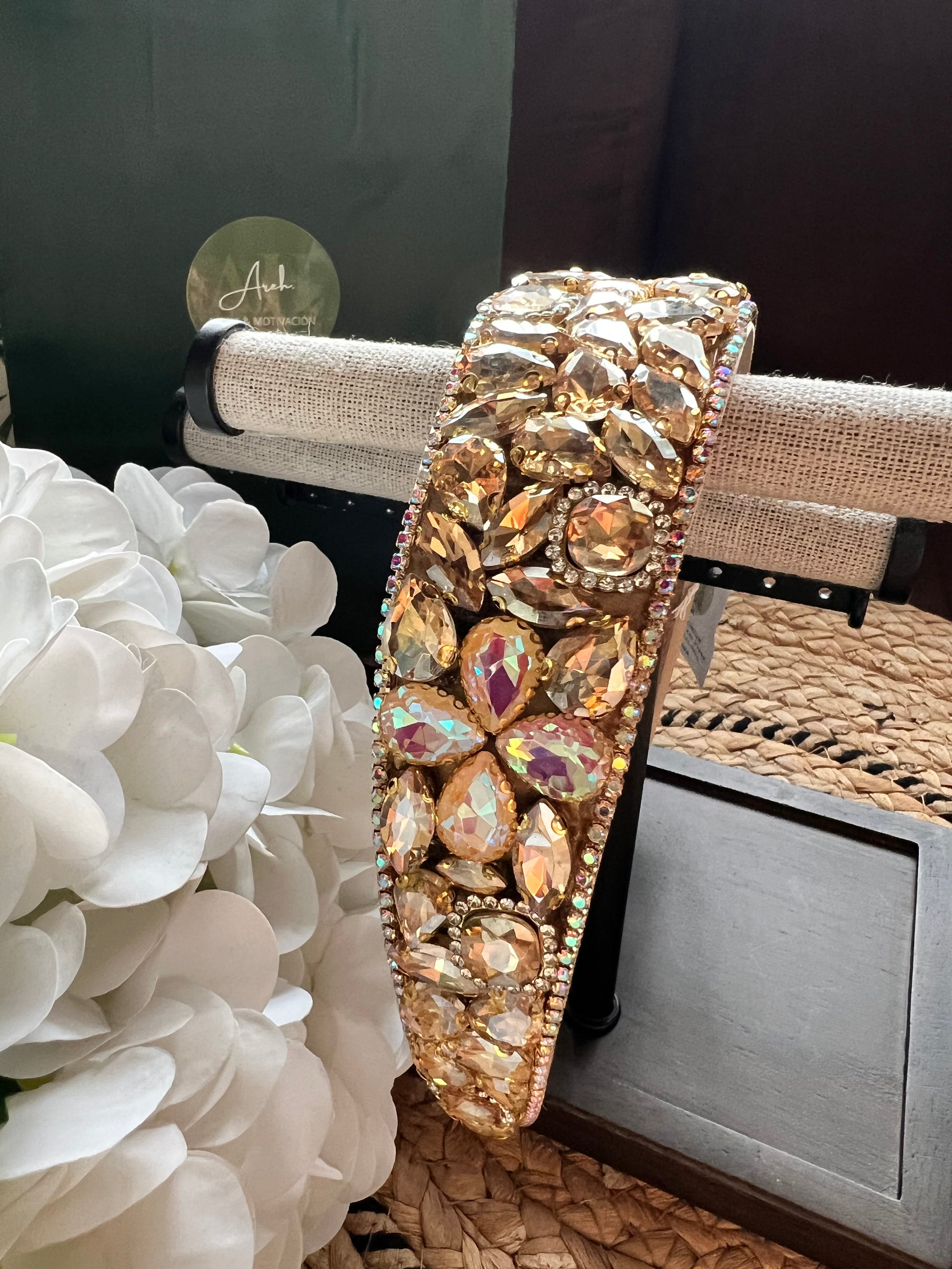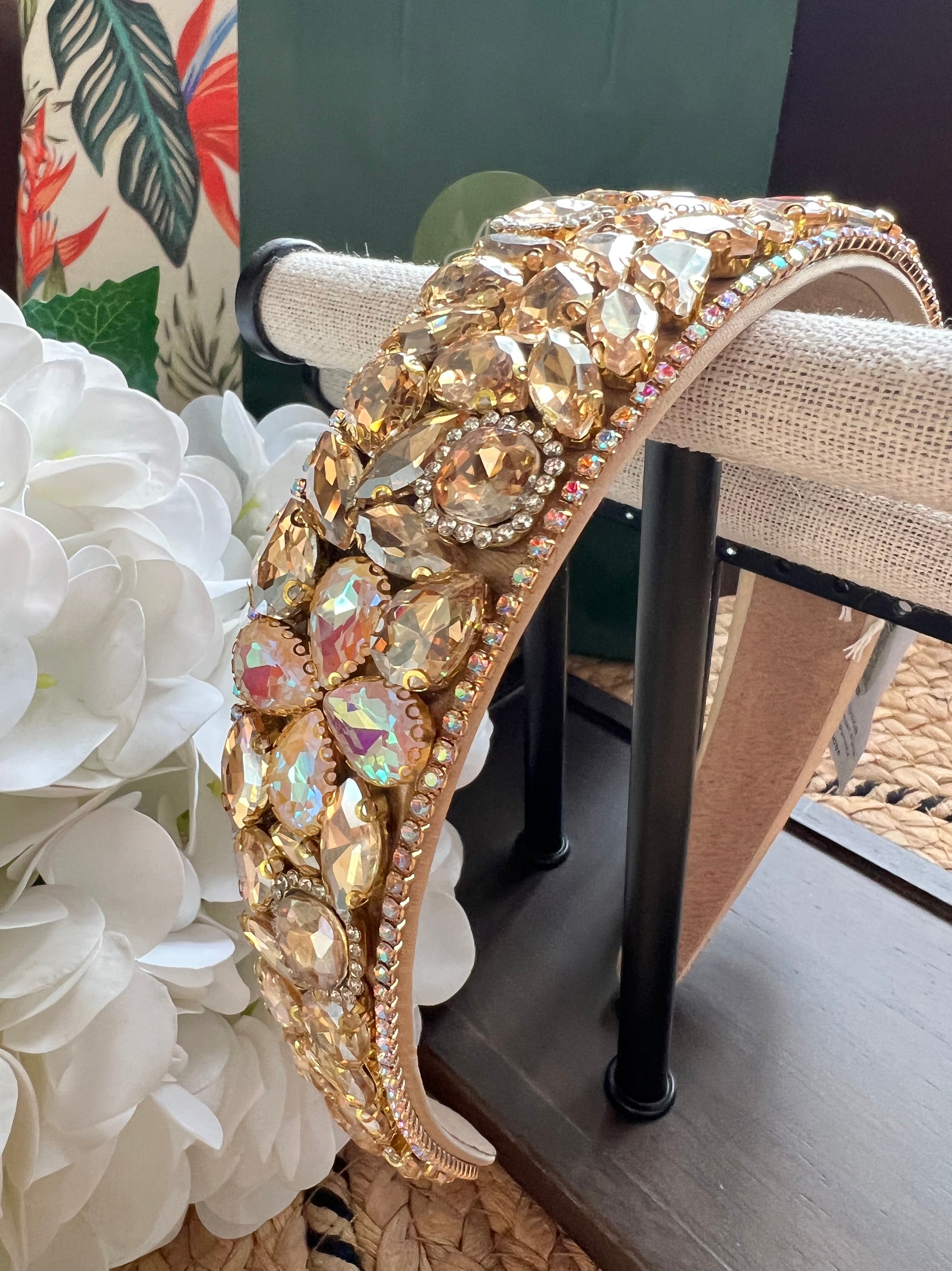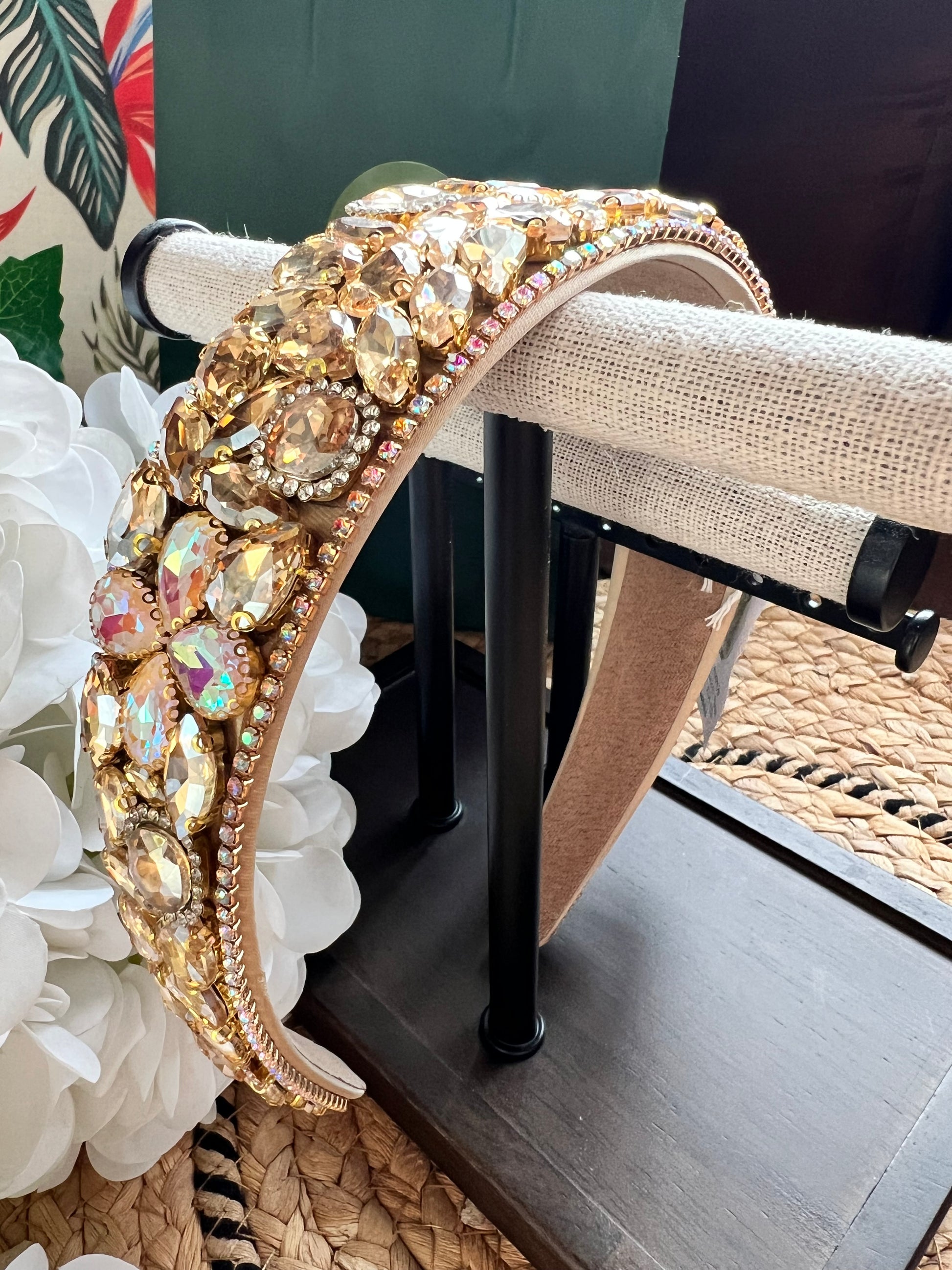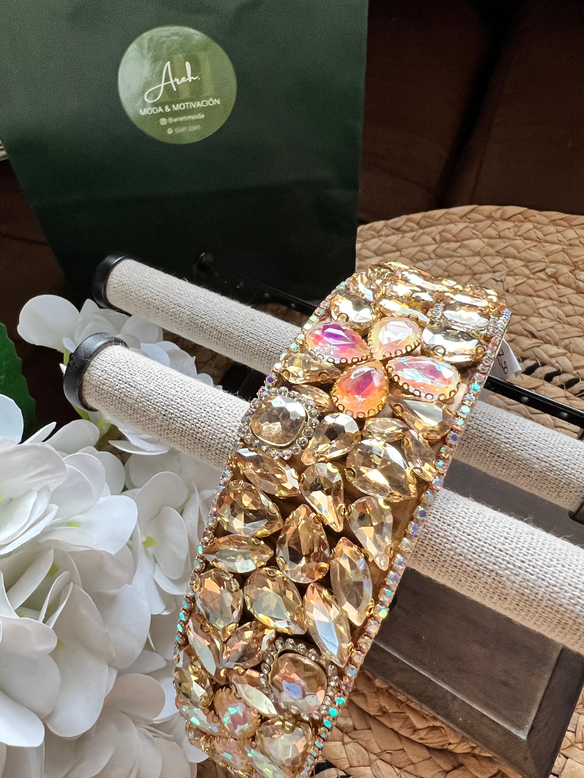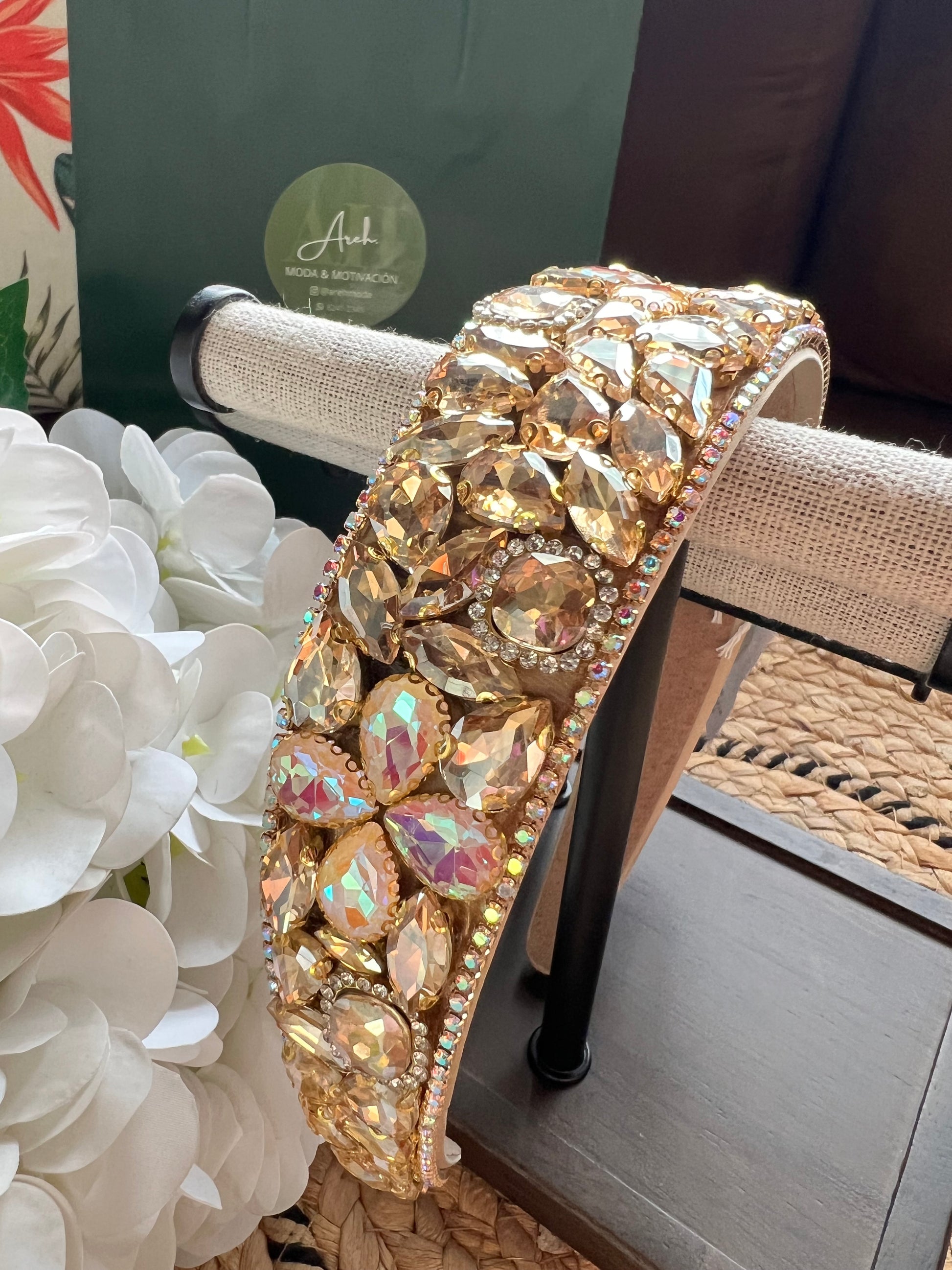 Diadema con gemas rosas en forma de flor en verde y dorado
