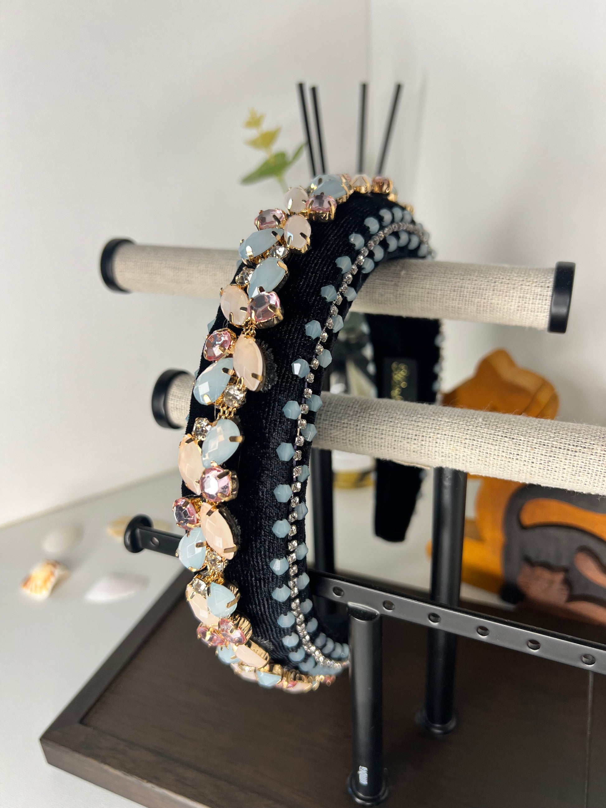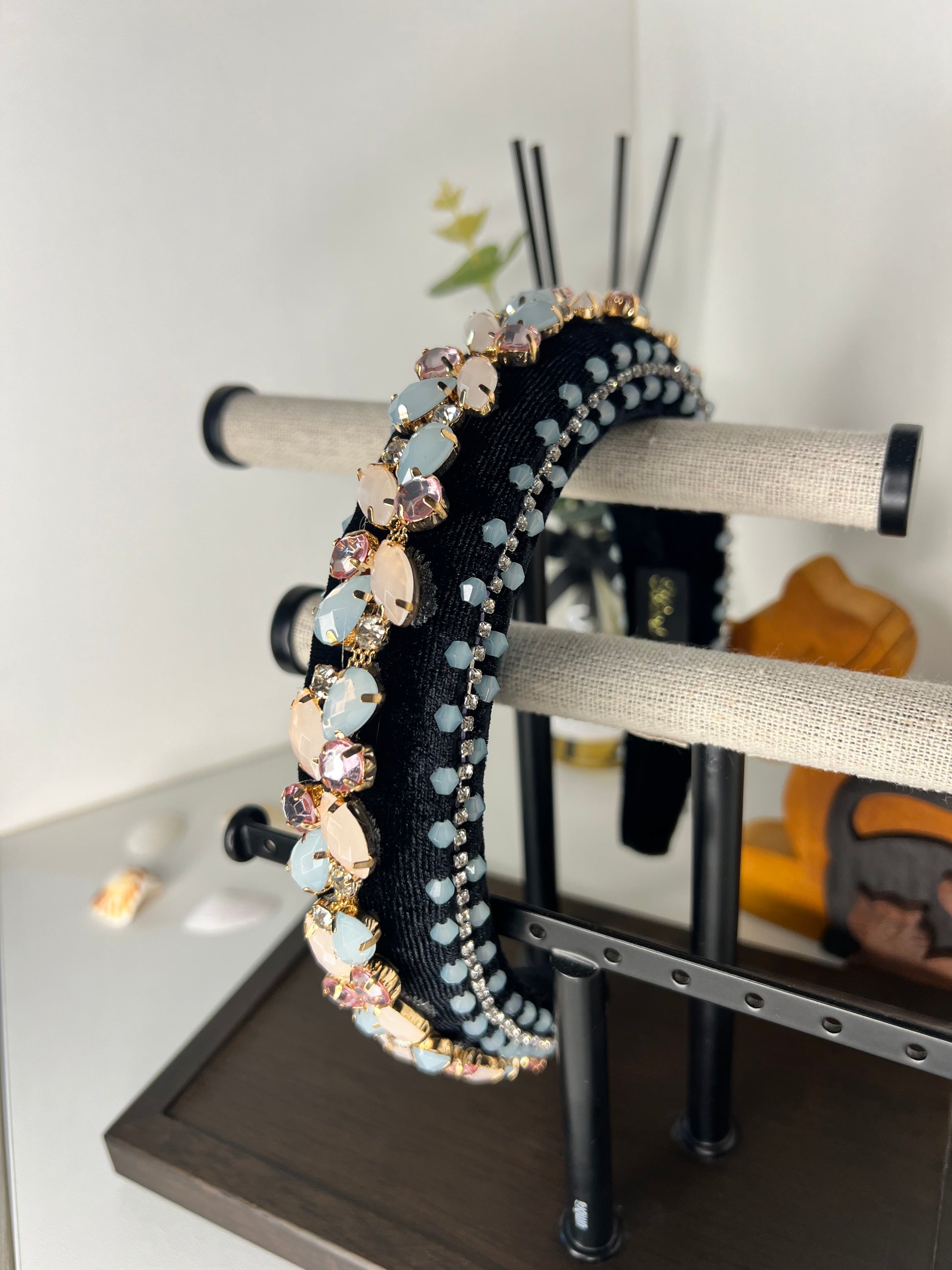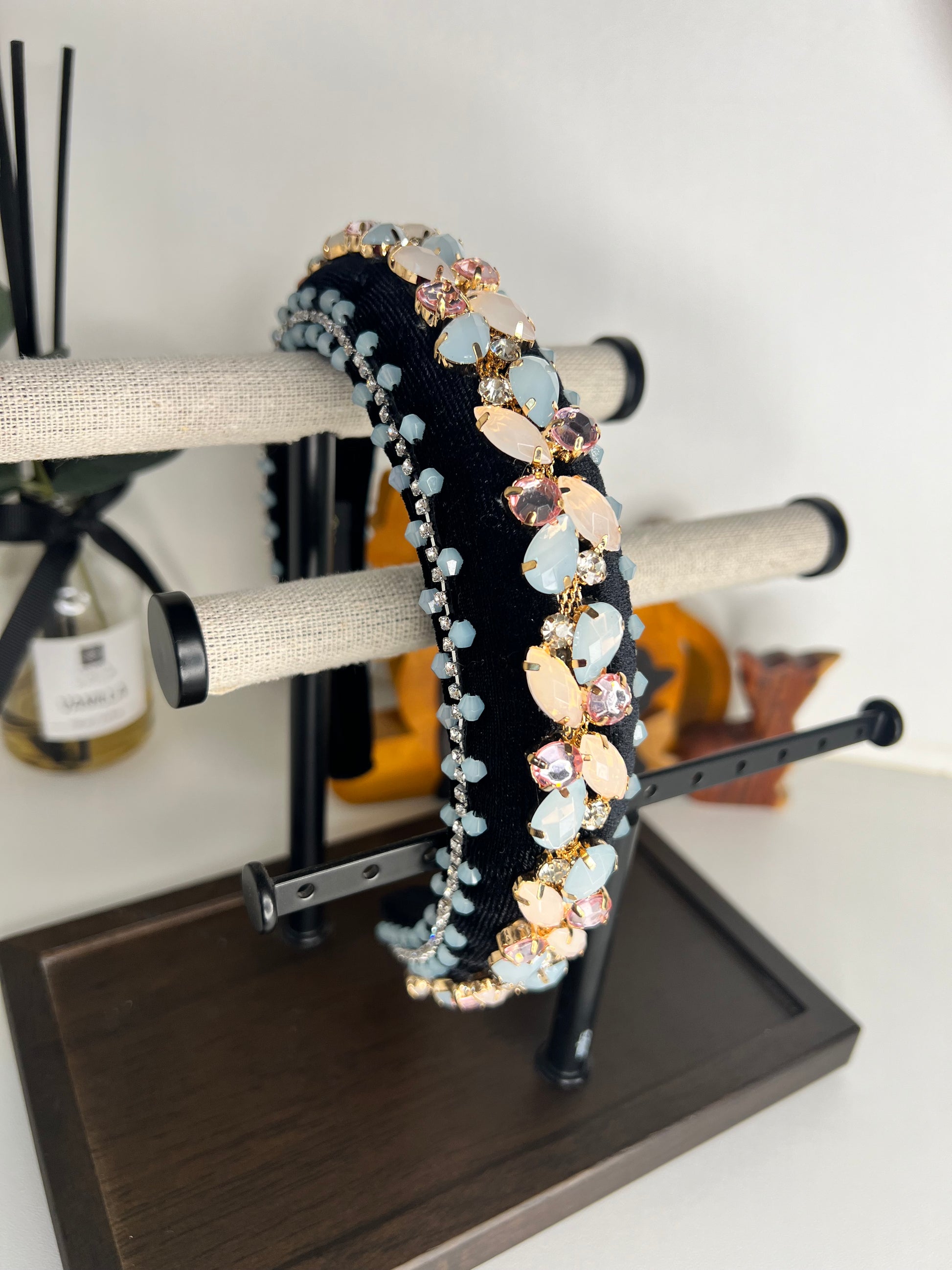 Diadema adornada con piedrería, cristales y perlas con fondo de terciopelo negro