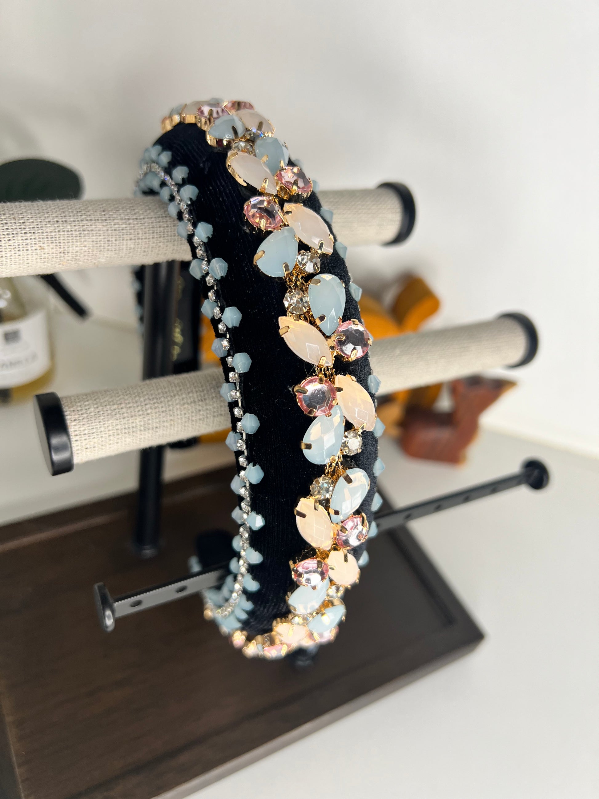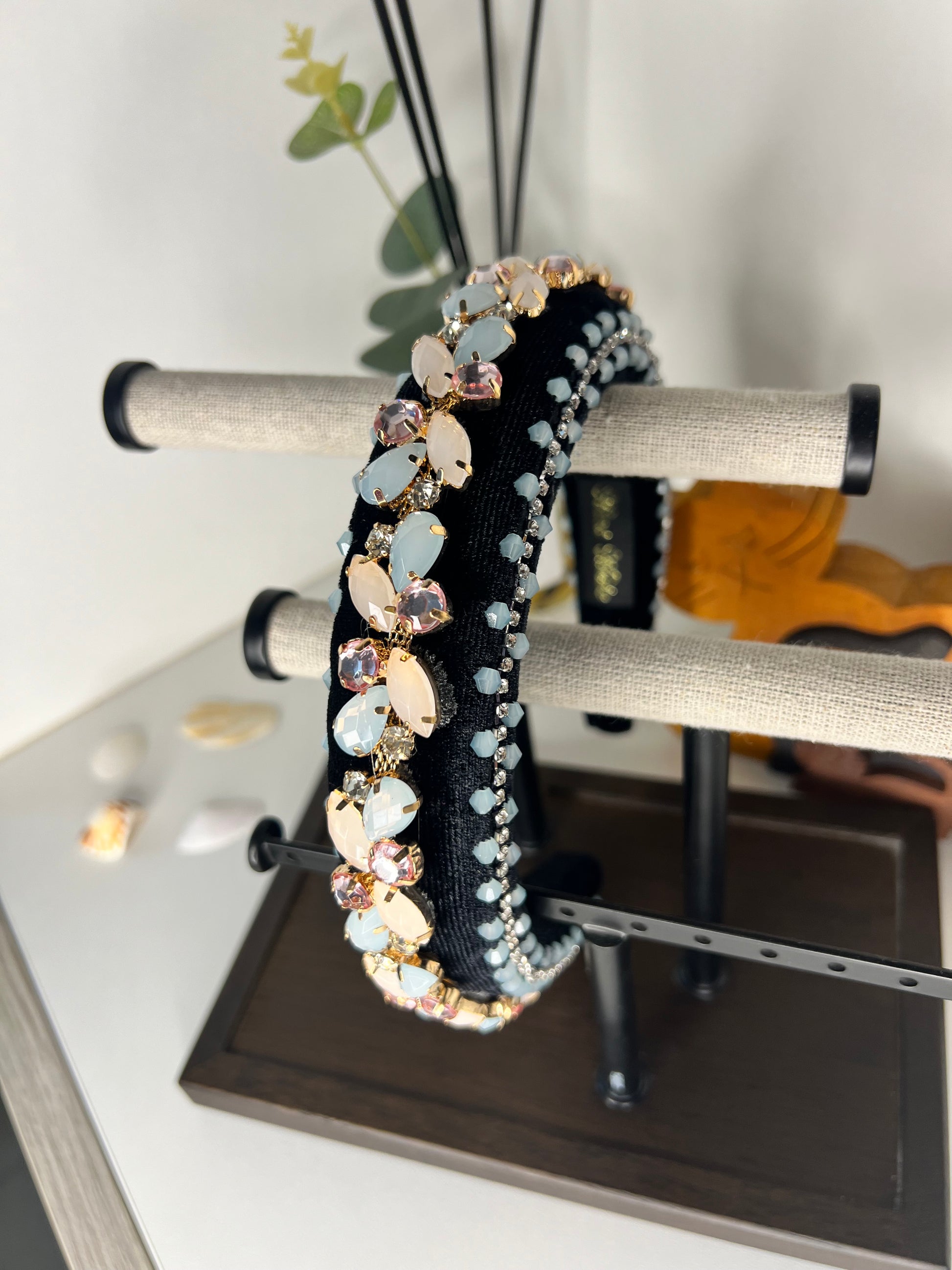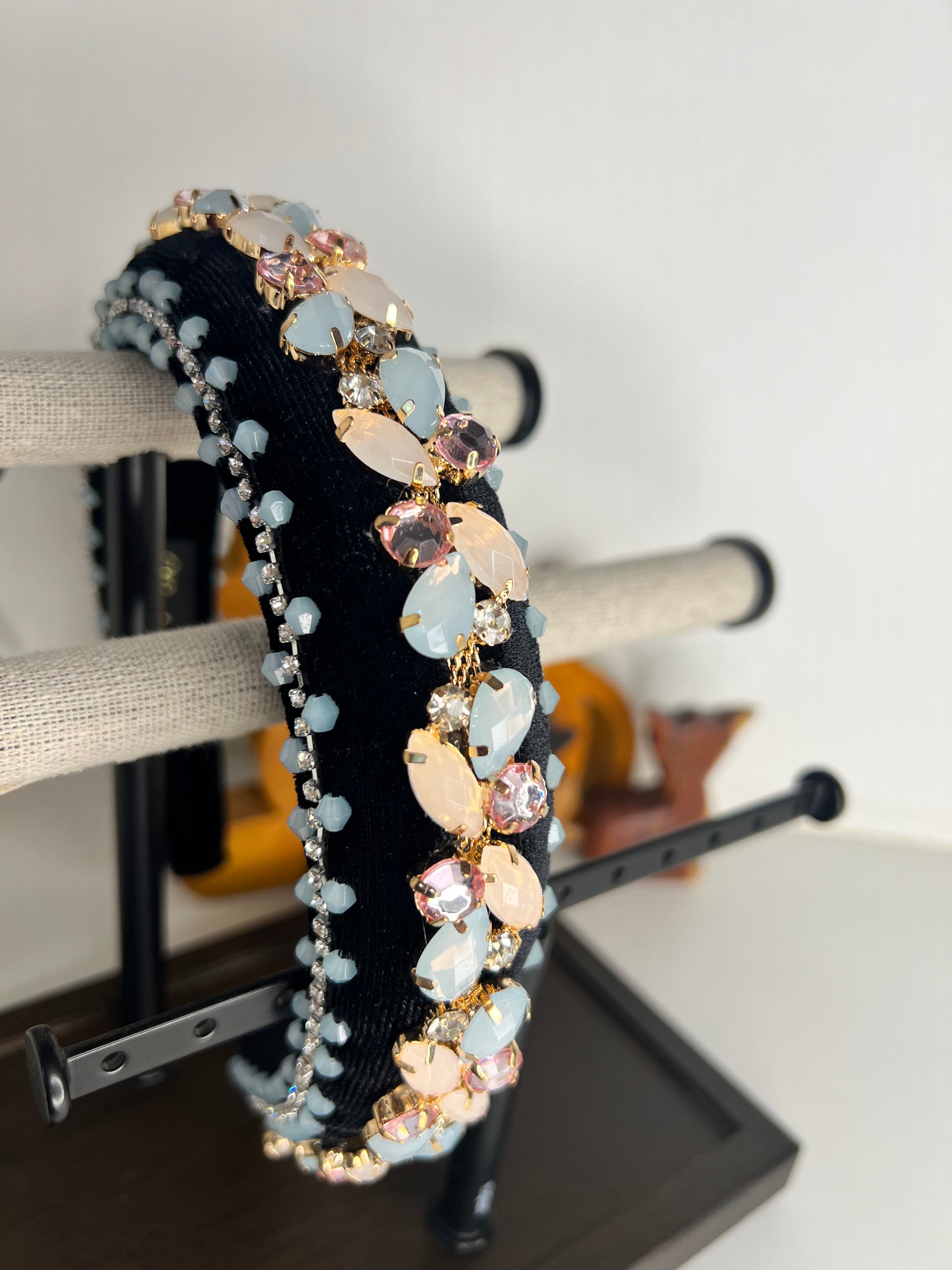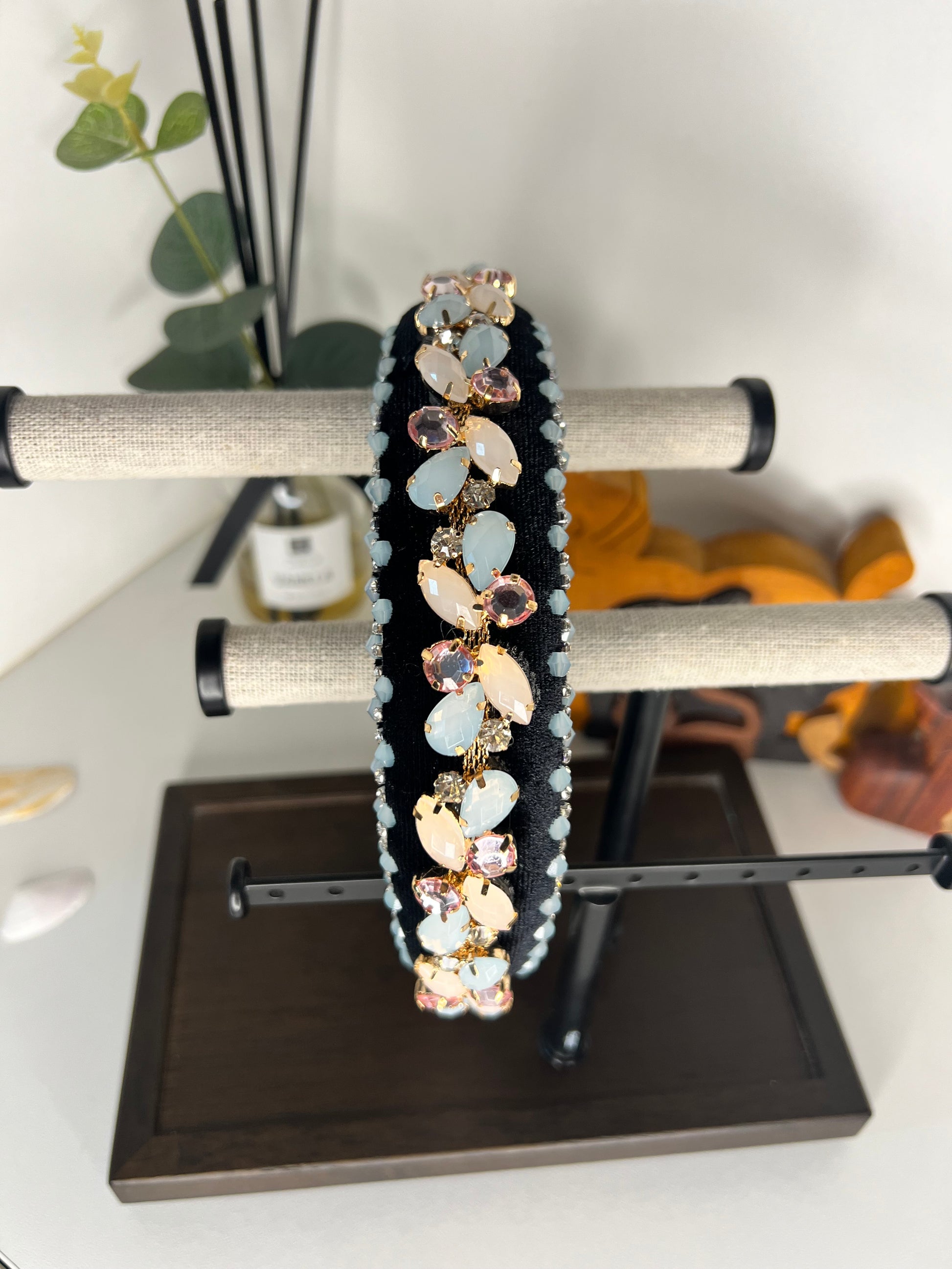 Diadema adornada con piedrería, cristales y perlas con fondo de terciopelo negro
