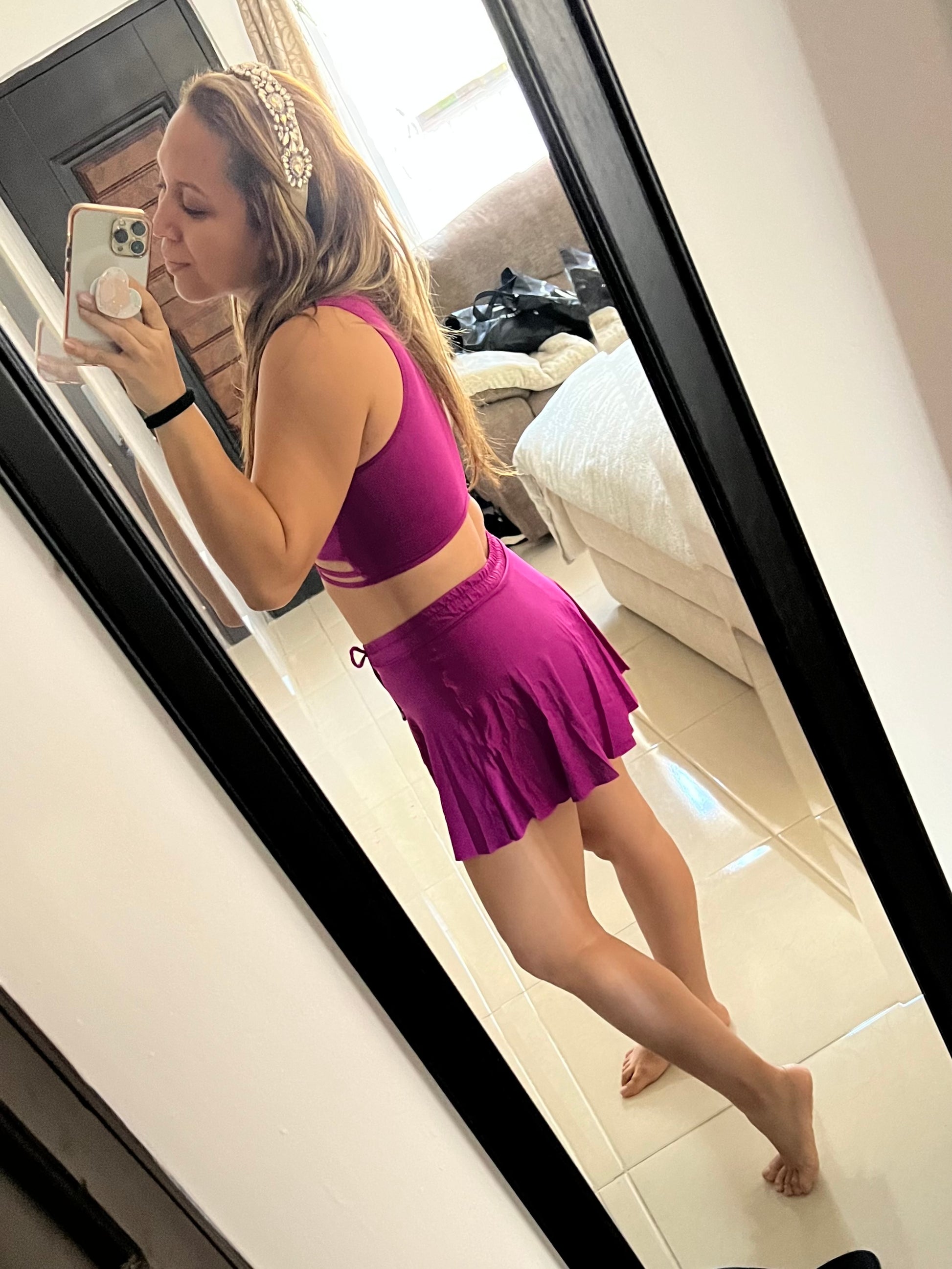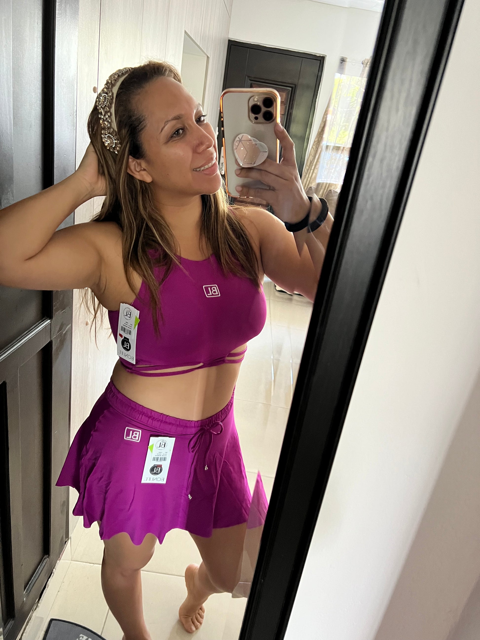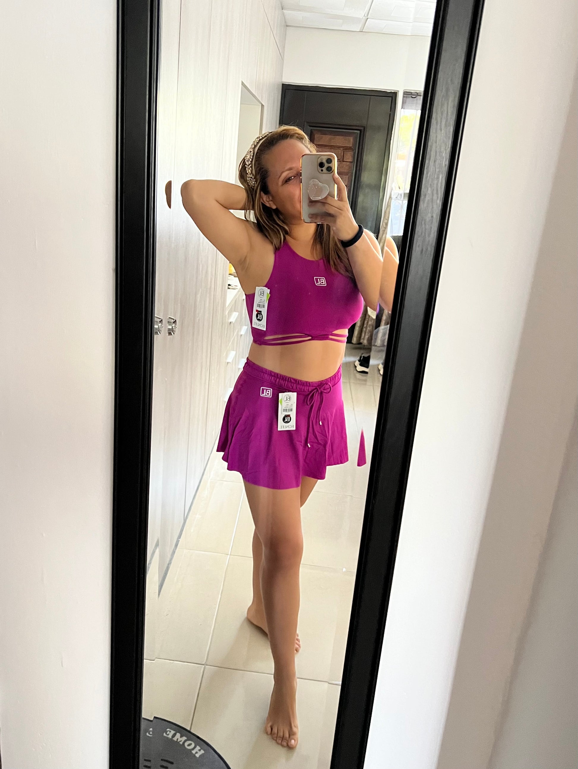 Conjunto deportivo de falda y top en color fucsia. Cuenta con bolsillos. Talla única, diseño cómodo y sexy. Marca colombiana