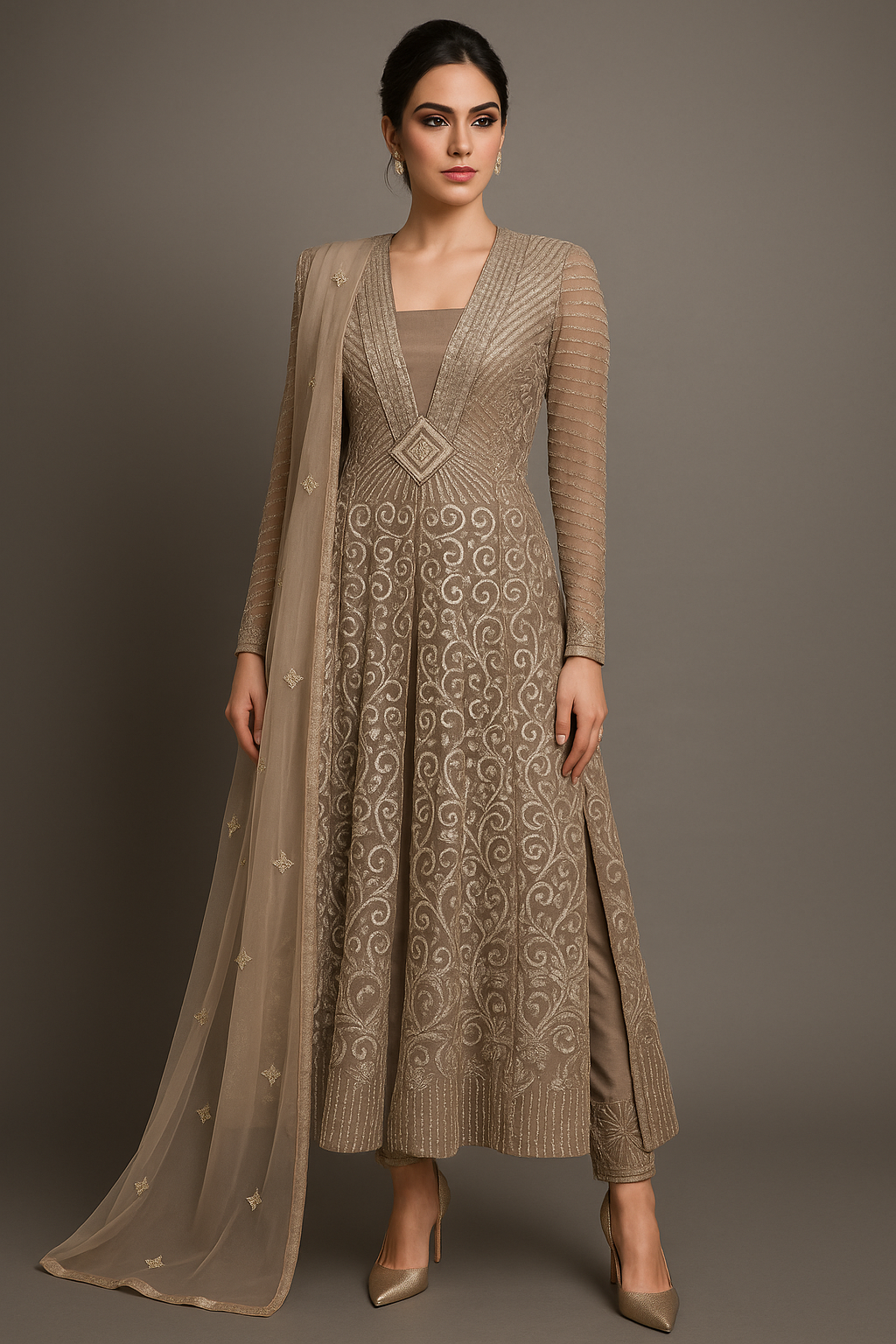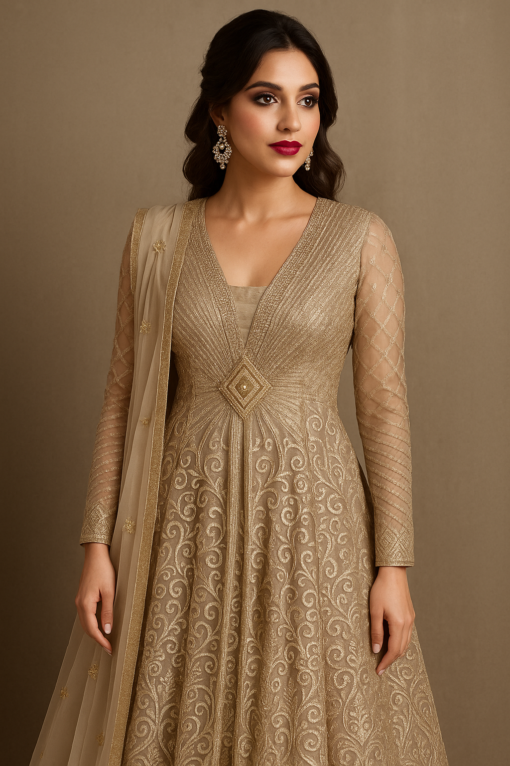 Este Anarkali en tono dorado champagne destaca por su exquisito bordado en hilo metálico que recorre todo el vestido, creando un efecto luminoso y refinado.