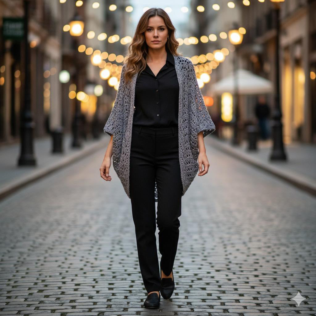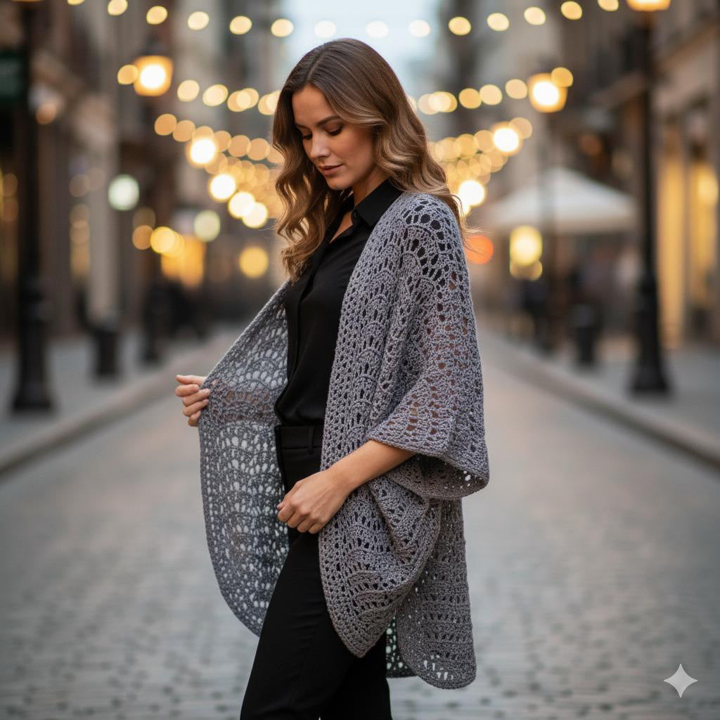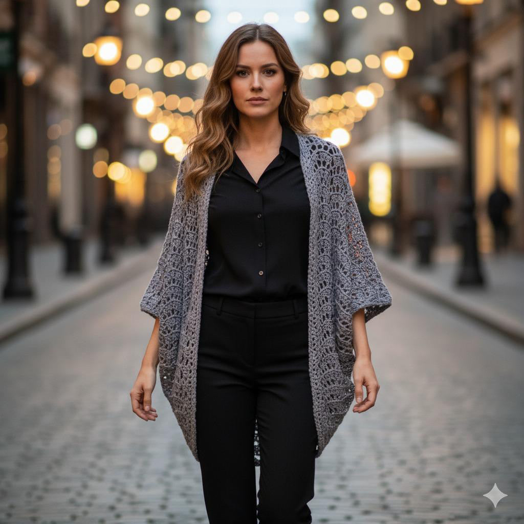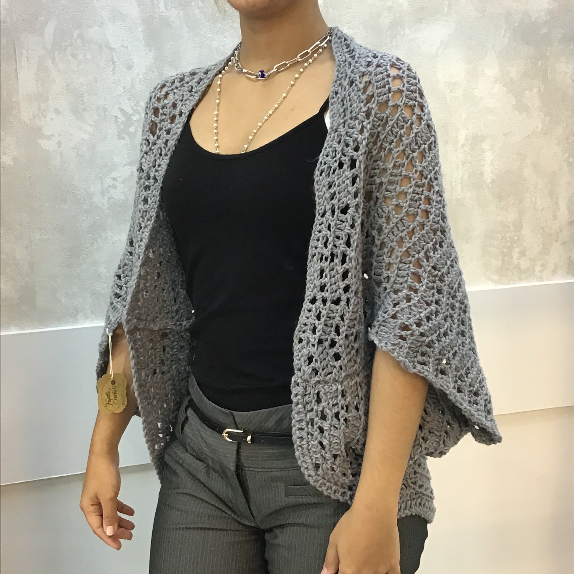Espectacular bolero gris con detalles geométricos en su forma, liviano y abrigador, Perfecto para una salida a cenar, un paseo al Valle o Boquete y ponerse un chal o bolero encima hecho a mano