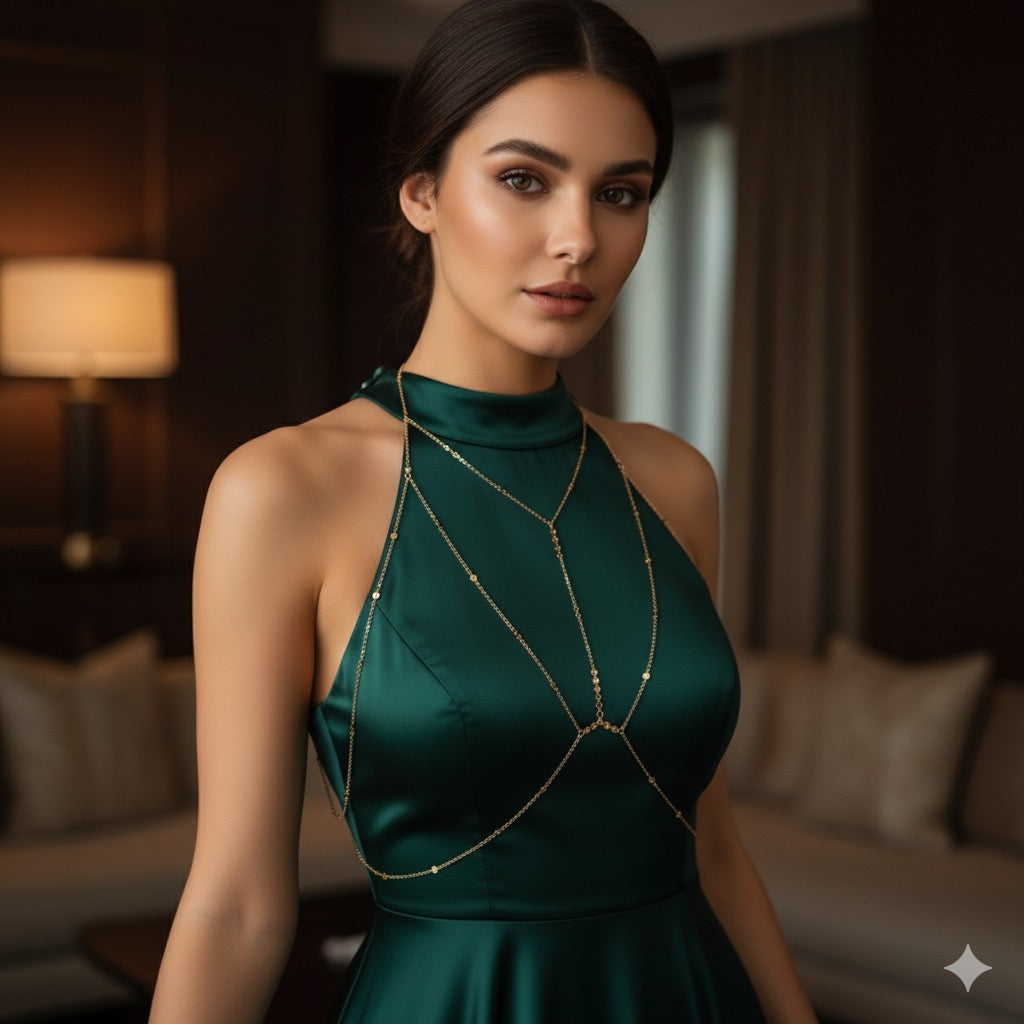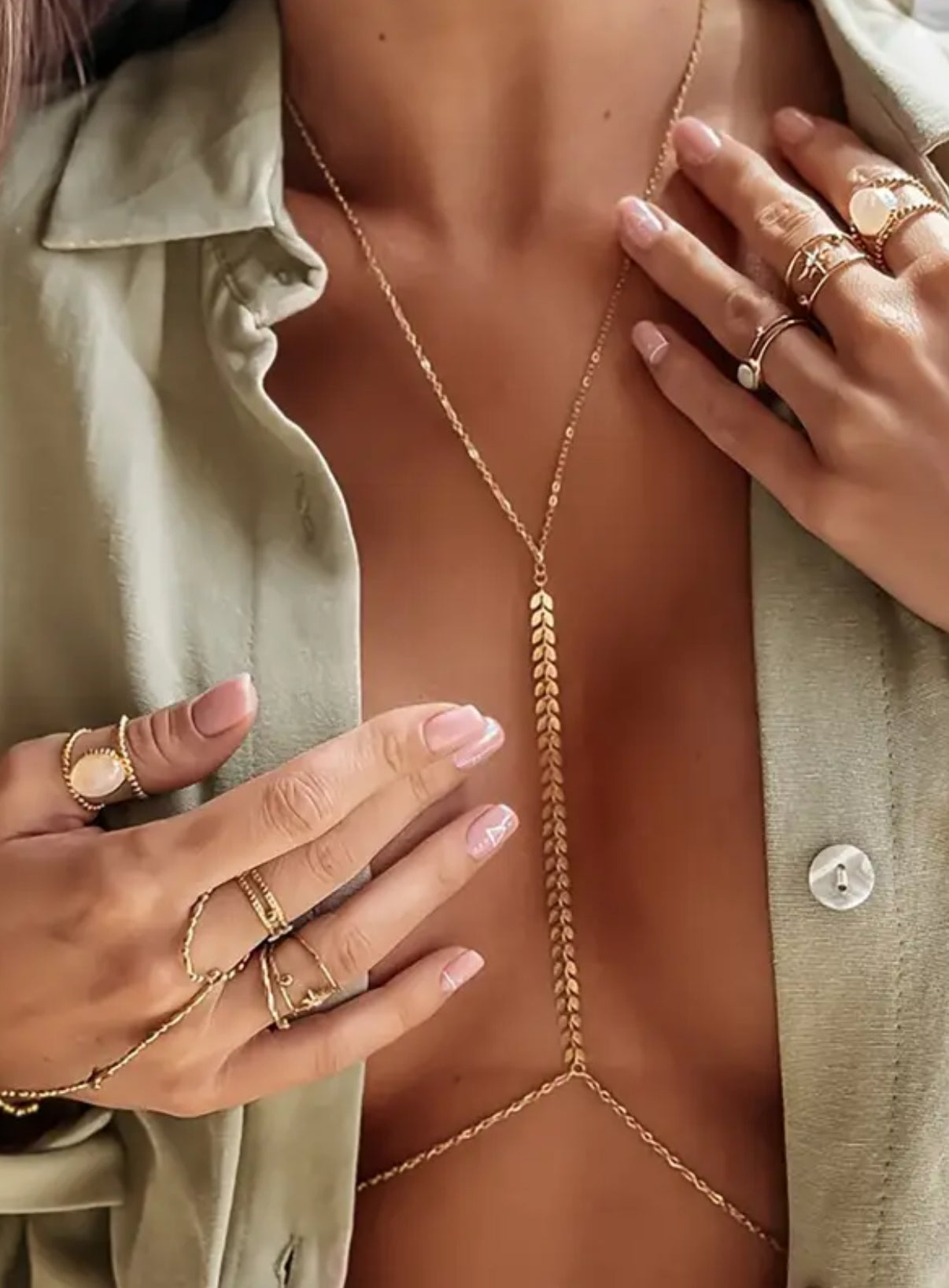 Nuestros body chains son el accesorio perfecto para destacar tu silueta con elegancia. Diseñados en delicadas cadenas doradas con detalles únicos, se adaptan a looks casuales, playeros o de noche, aportando un toque sofisticado y moderno.