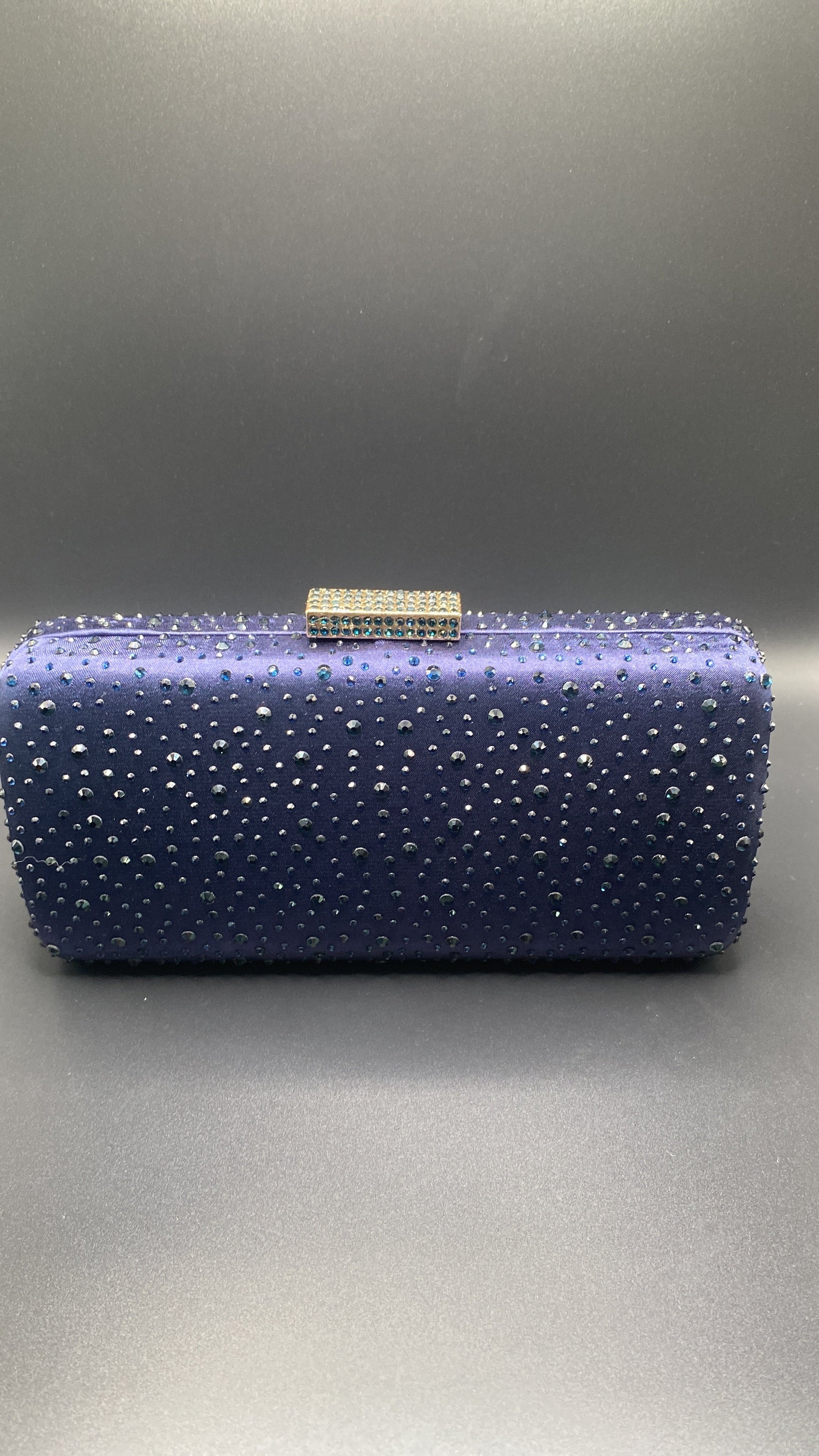 Elegante clutch en tono azul marino detallada en fina cristalería en tono a juego