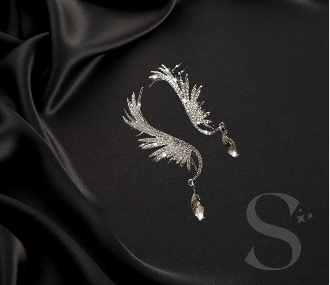 Aretes estilo cubreorejas, en tono plateado formando alas.