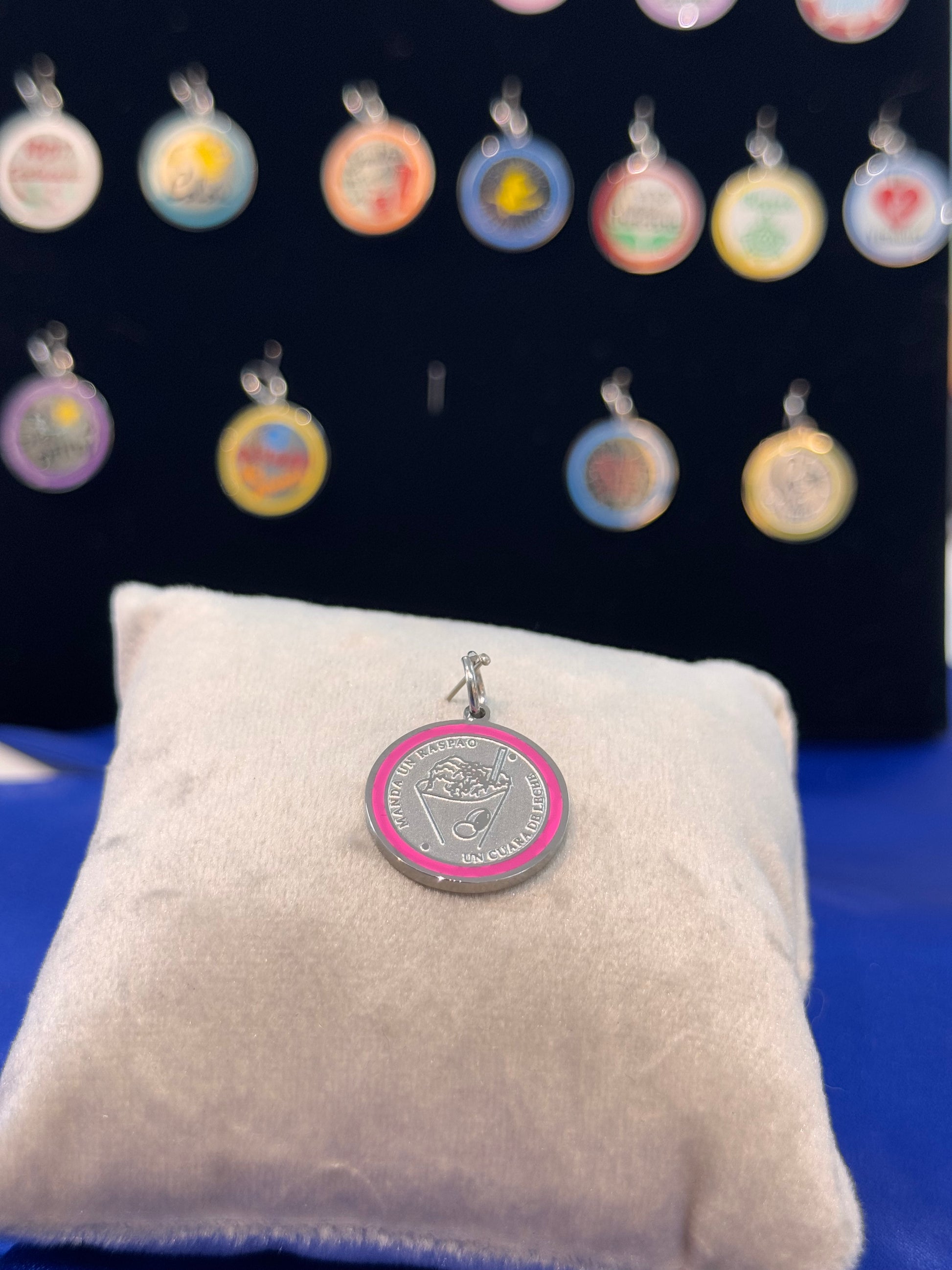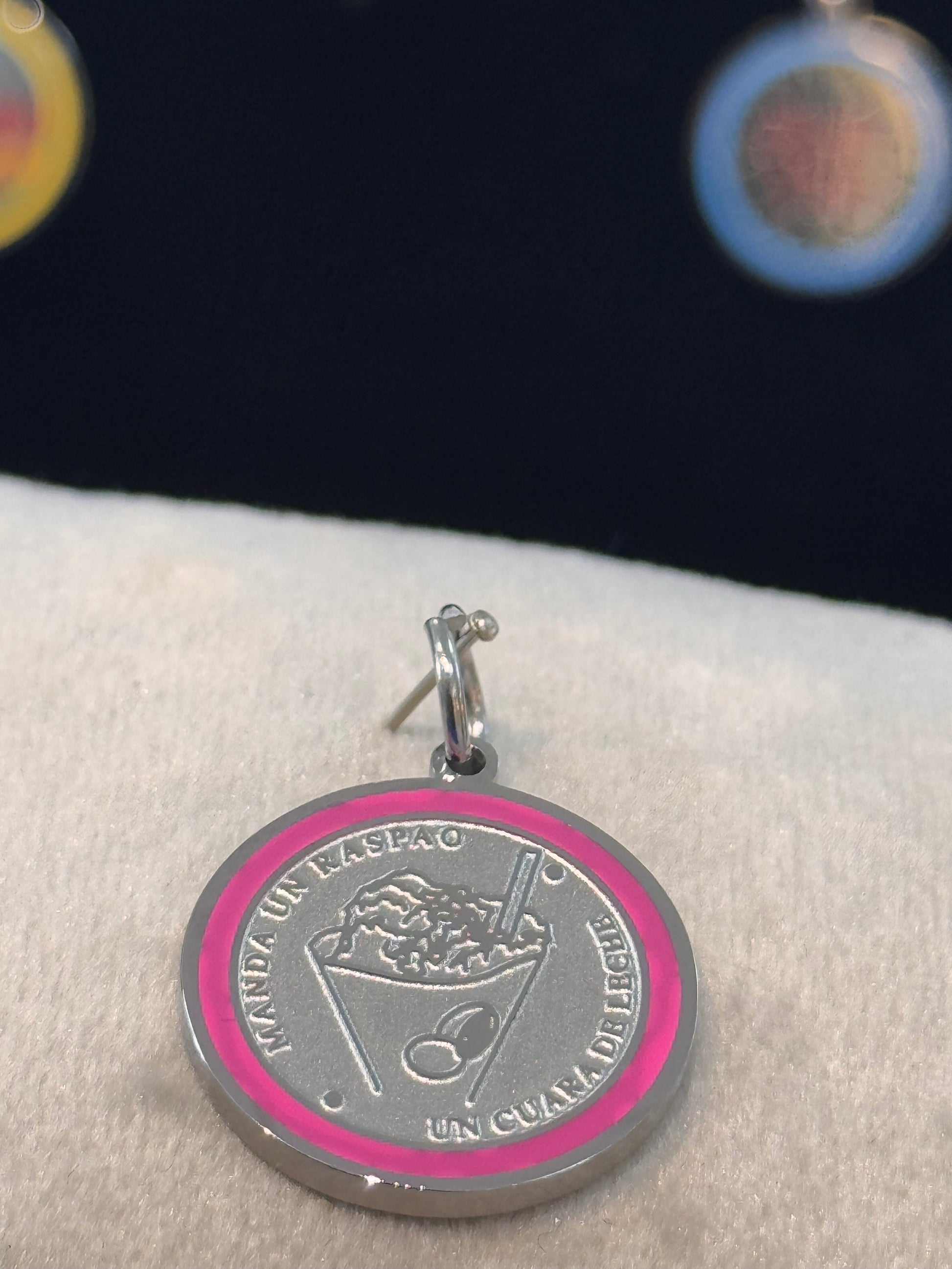 DIJE PLATEADO DE EDICIÓN LIMITADA DE ACERO INOXIDABLE CON DISEÑO DE MANDA UN RASPAO Y UN CUARA DE LECHE
