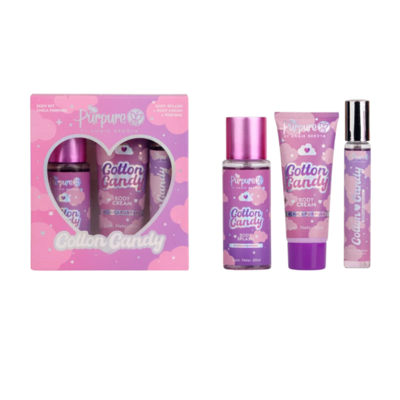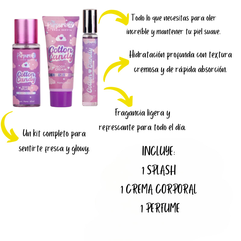 Déjate envolver por la fragancia más deliciosa y envolvente con el Set Corporal Cotton Candy de Purpure. Un trío perfecto para que tu piel huela increíble y se sienta suave e hidratada todo el día.