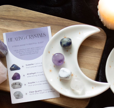 Este hermoso conjunto de cristales curativos incluye cuatro piedras pulidas para ayudar a reducir el estrés, aliviar la ansiedad y promover un sueño reparador. Cuenta con un platito en forma de luna creciente, una tarjeta informativa a juego y una bolsa de tela con cordón impresa, lo que lo convierte en un regalo pensado para quienes necesitan un poco de cuidado adicional. Las piedras son sodalita, amatista, howlita y cuarzo transparente.