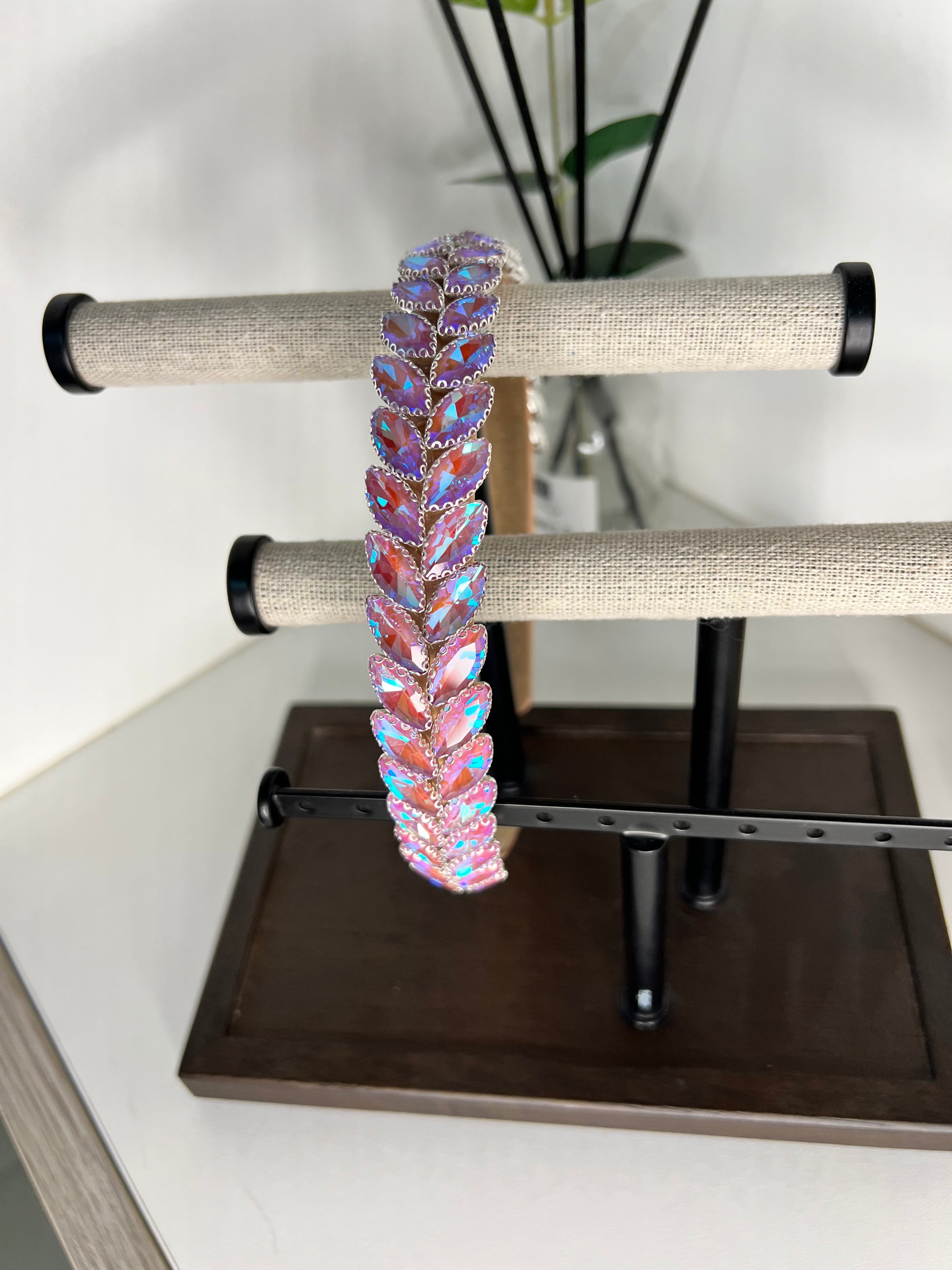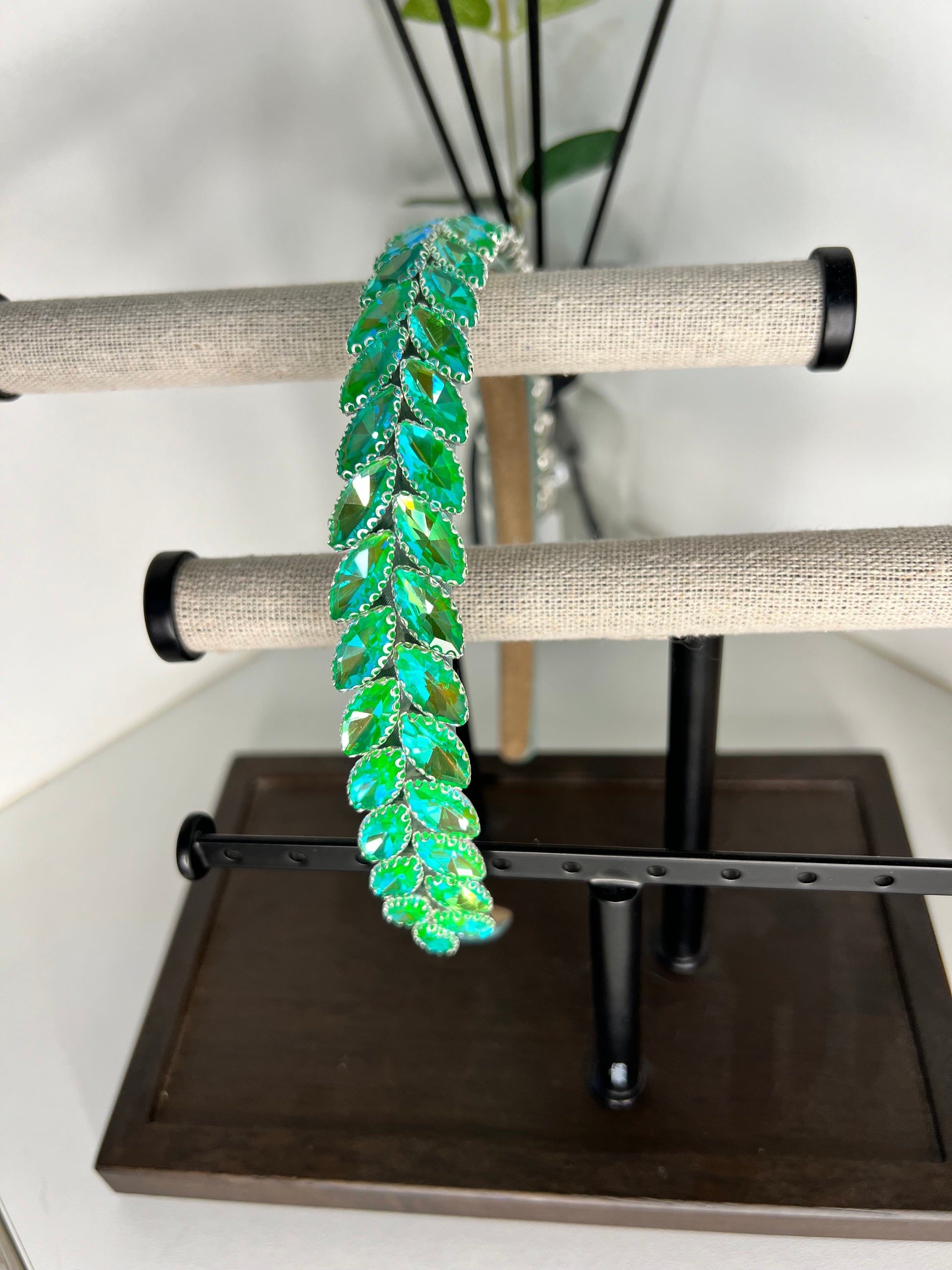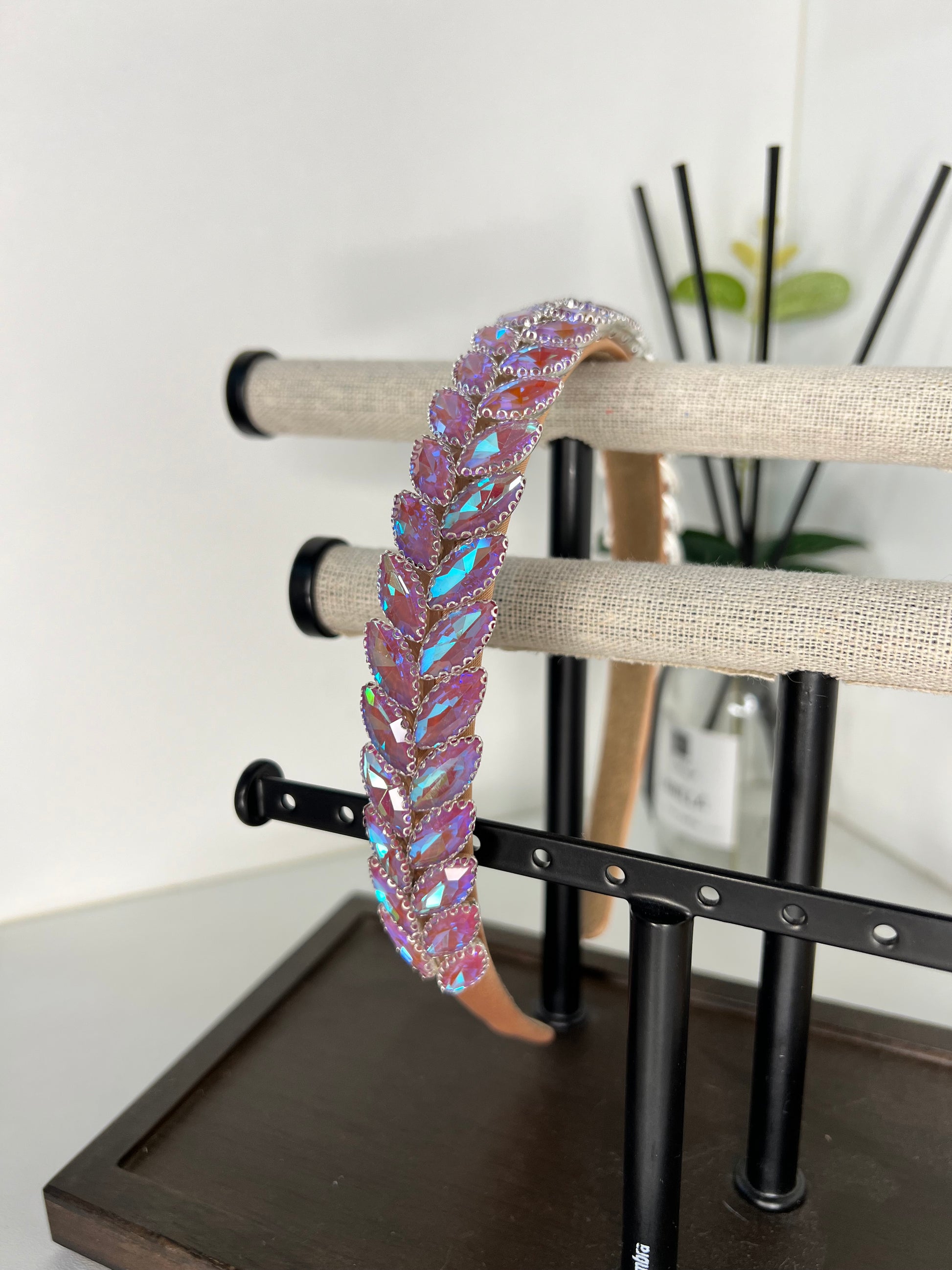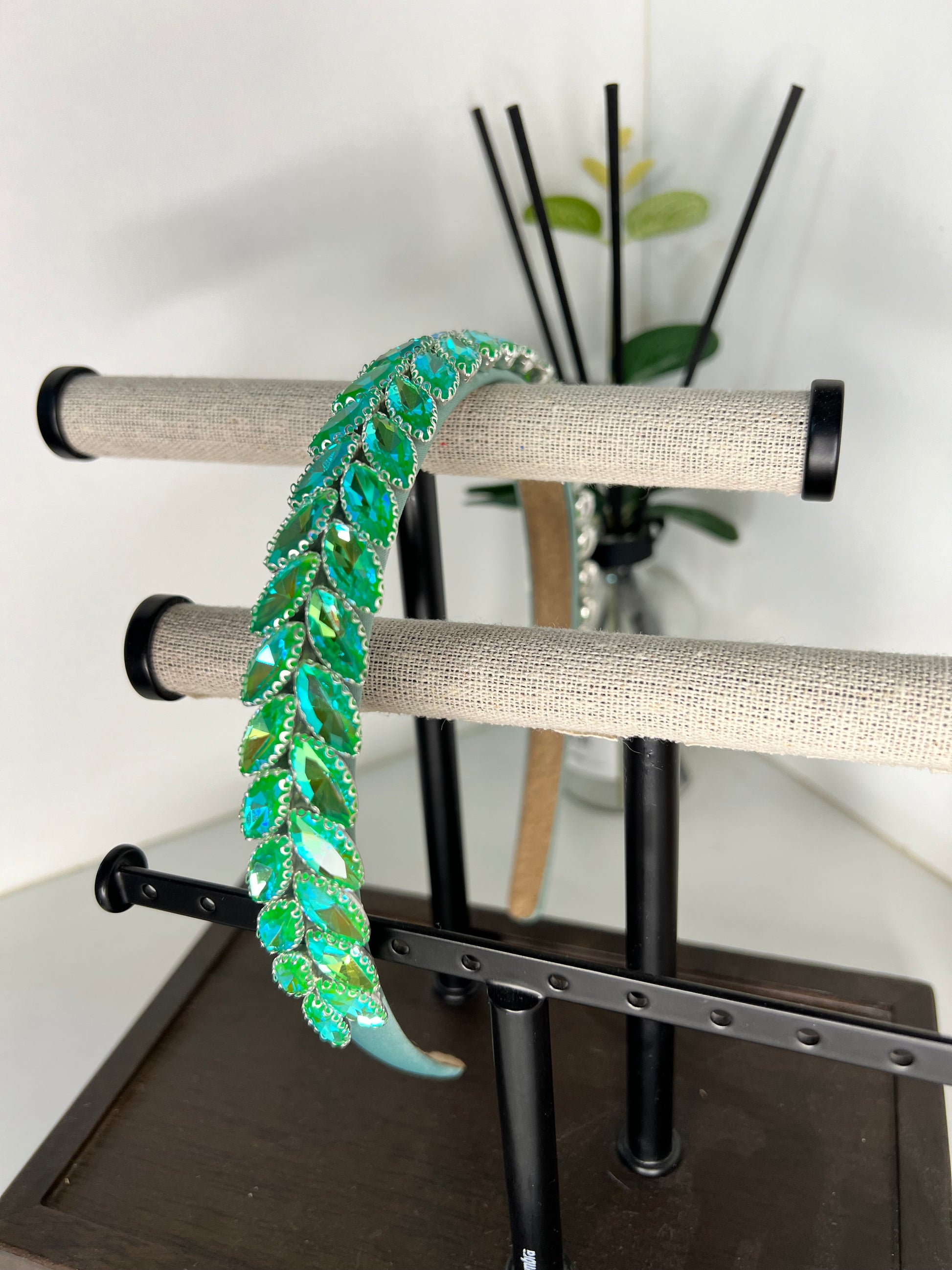 Diadema delgada con diseño de hojas de cristal. En color blanco, verde y rosado