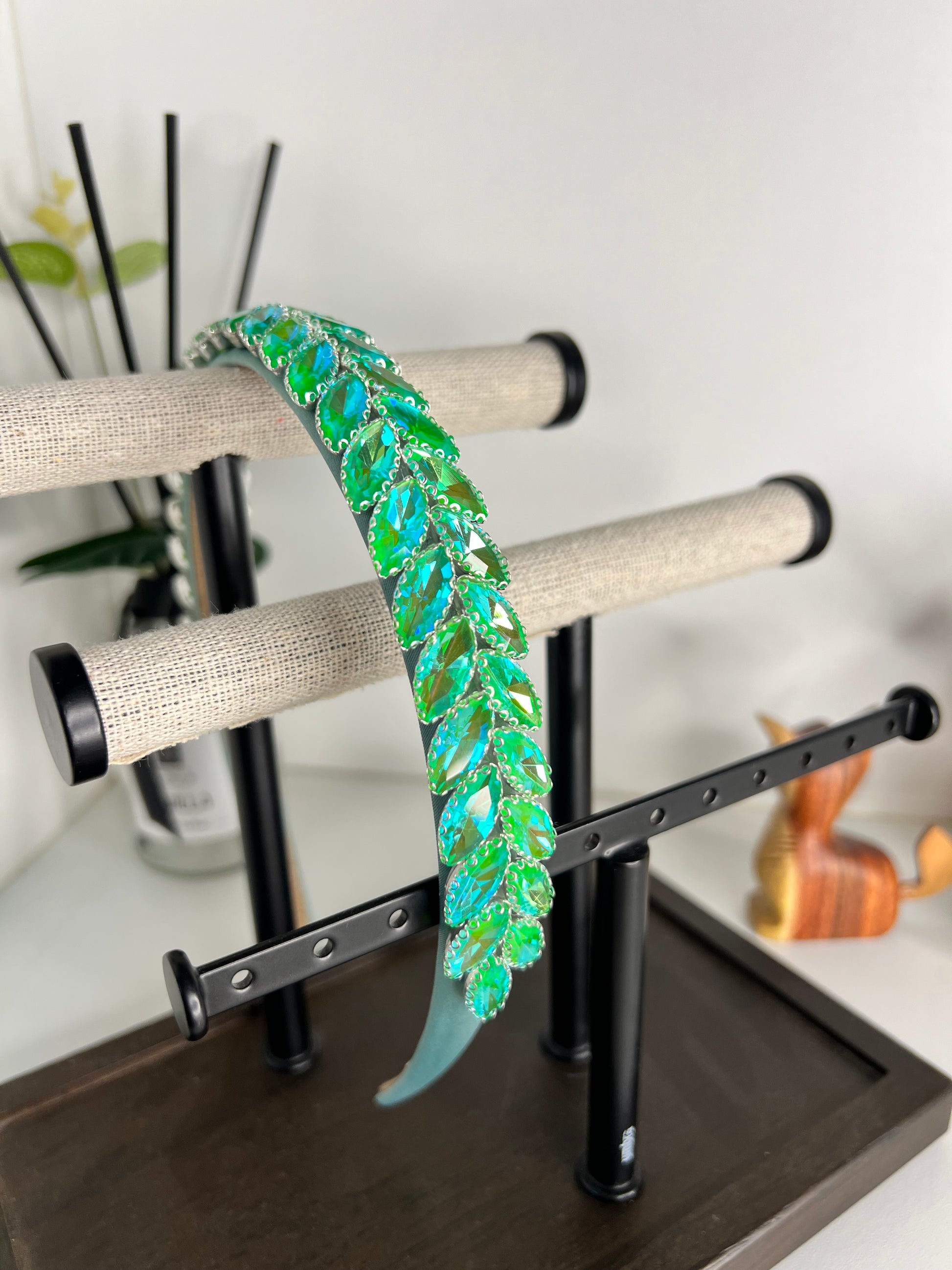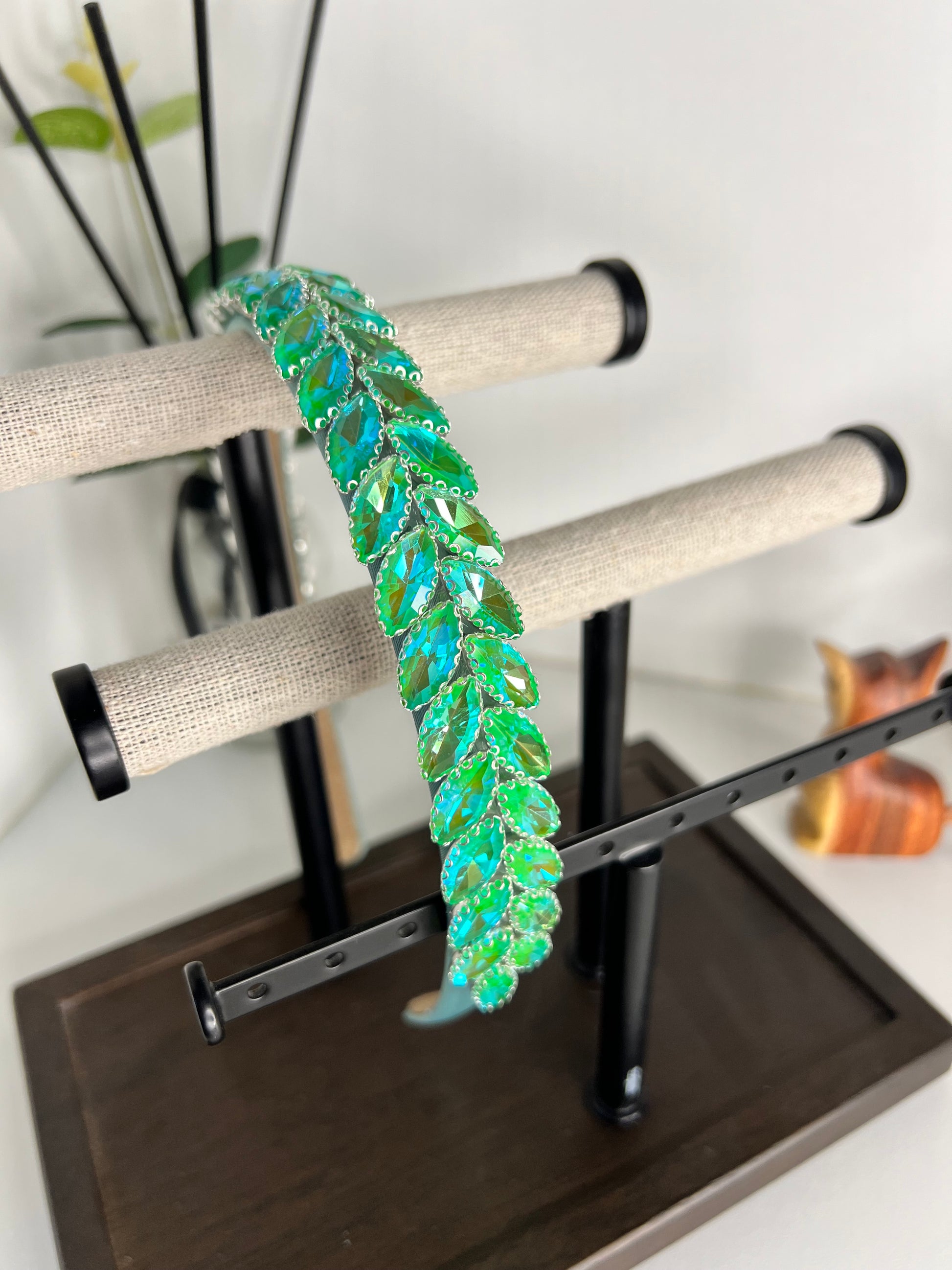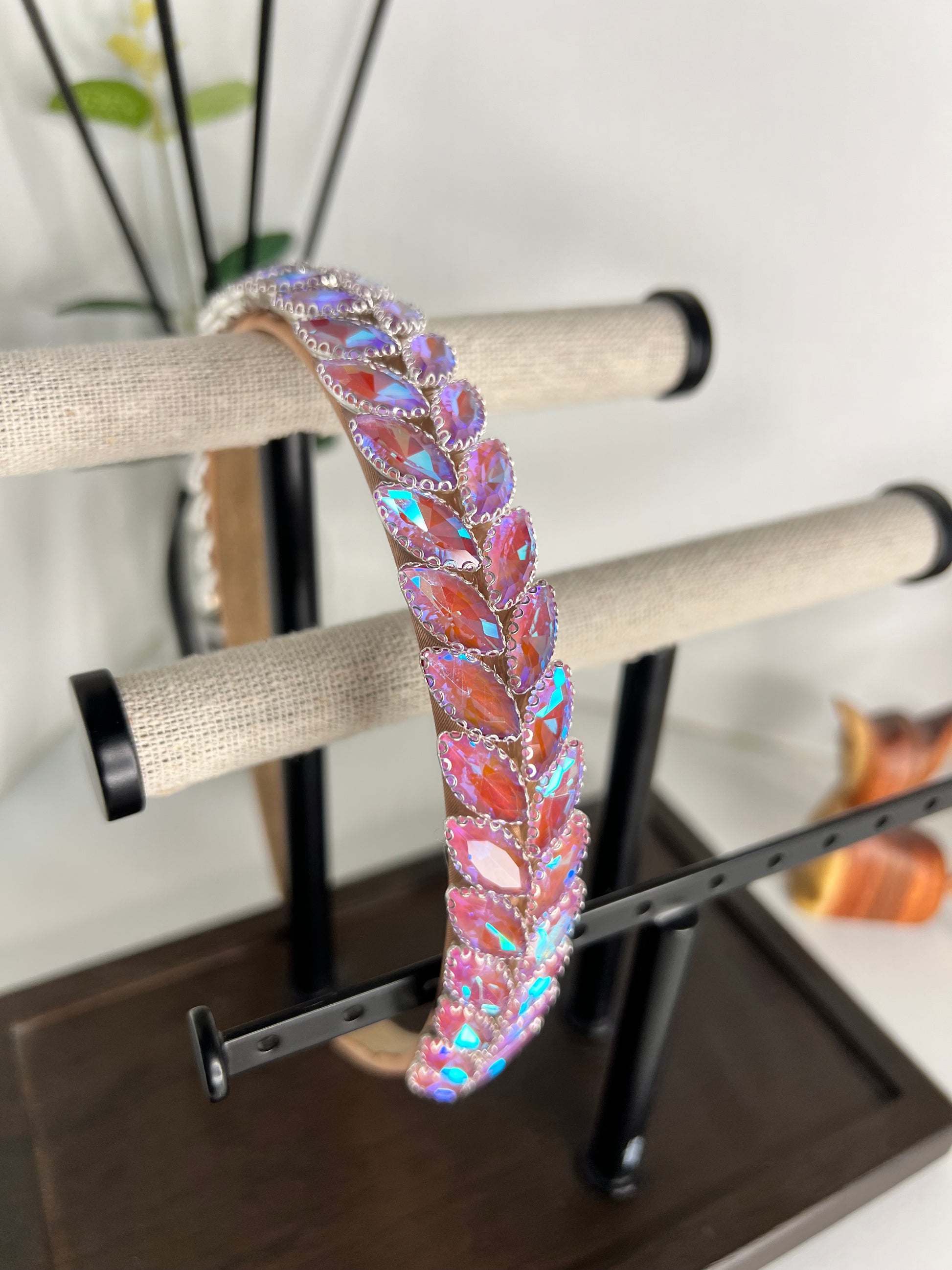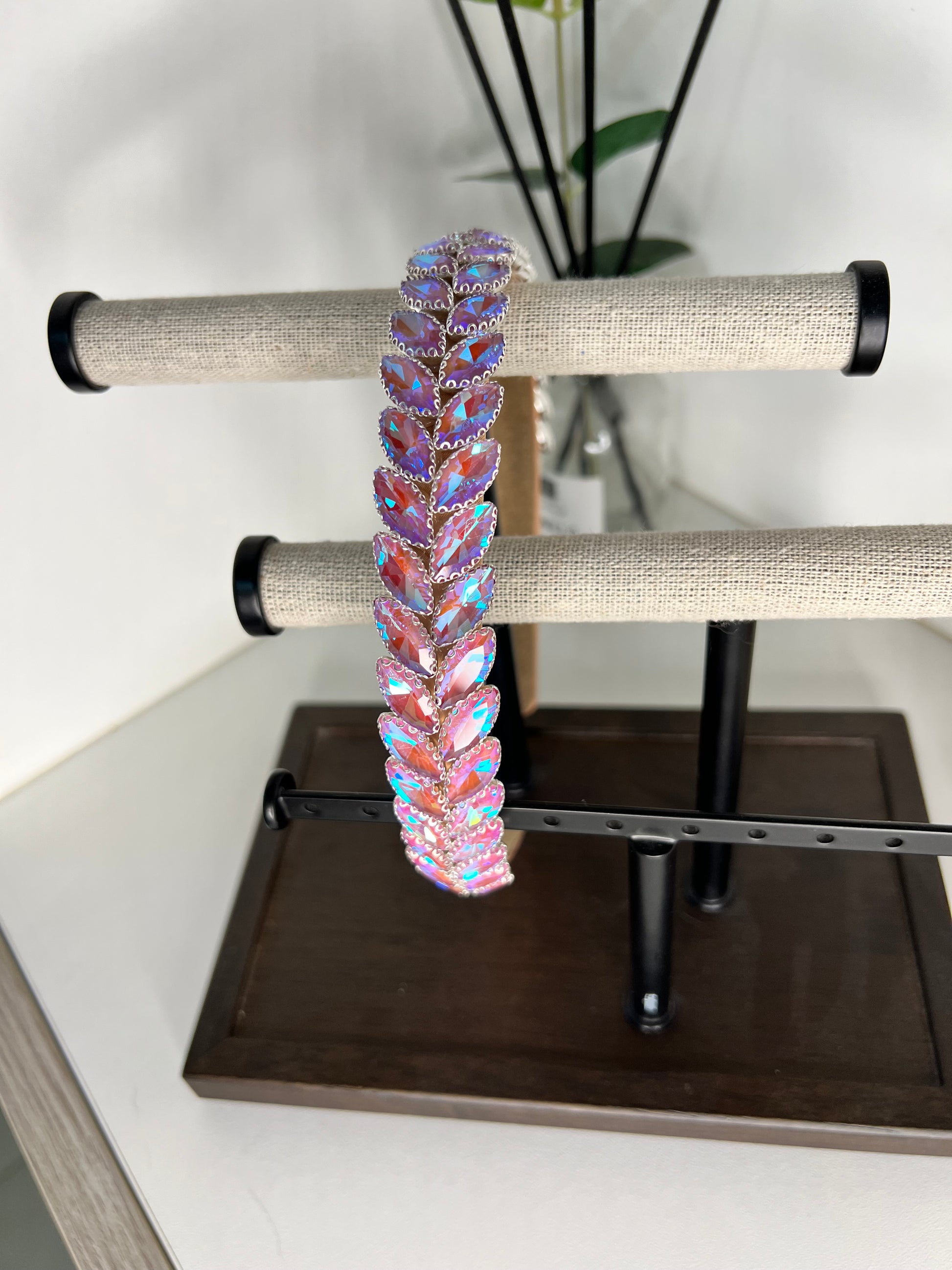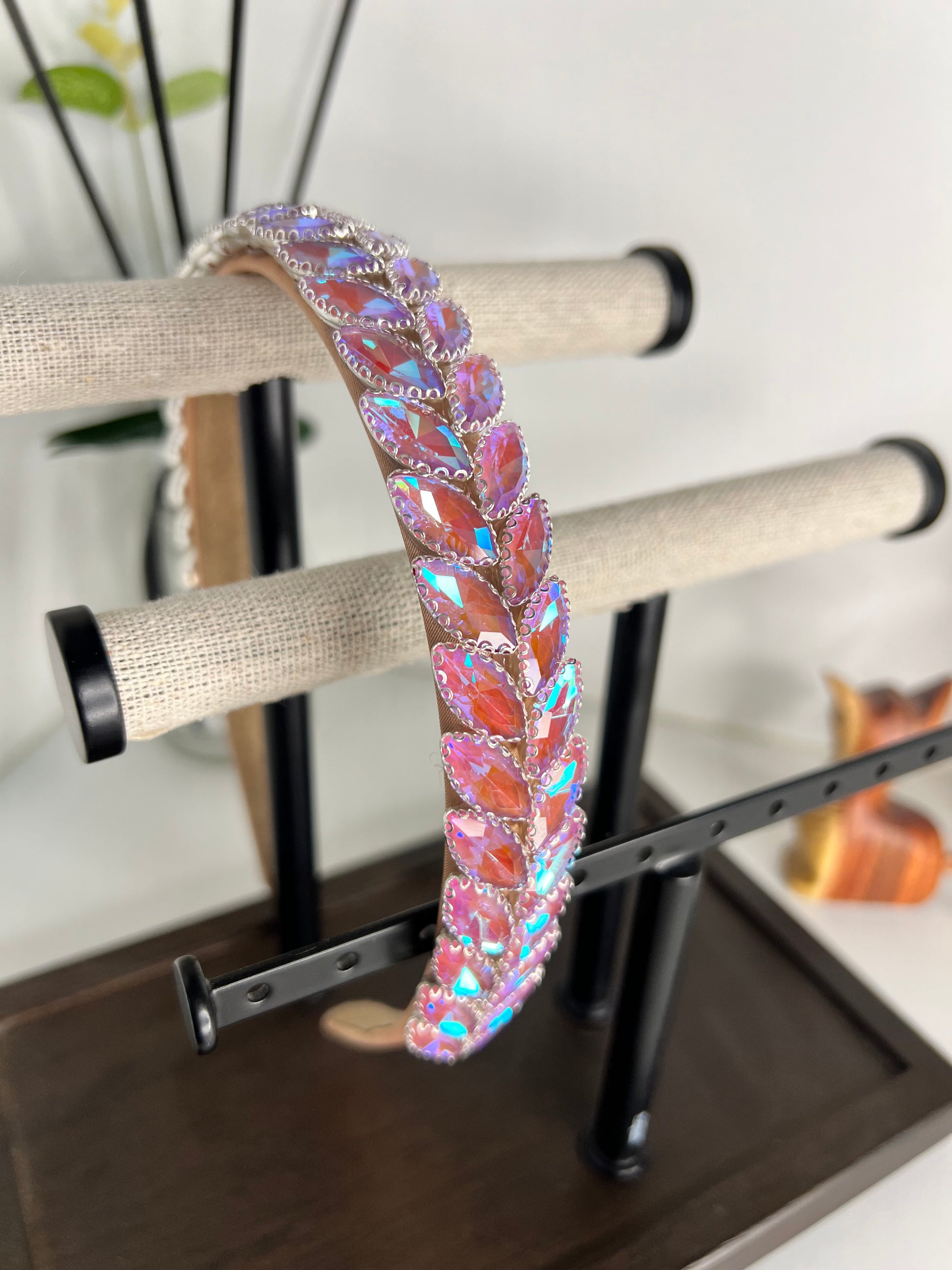 Diadema delgada con diseño de hojas de cristal. En color blanco, verde y rosado