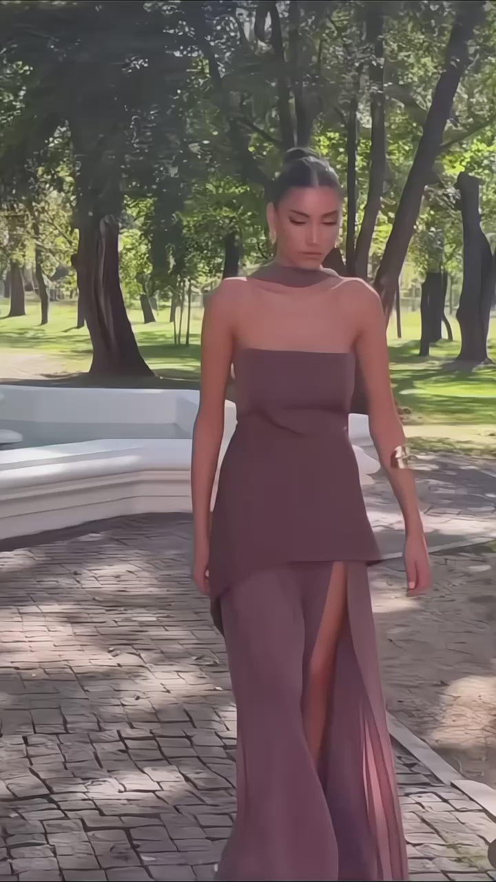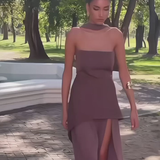Vestido largo con abertura lateral y escote strapless recto que estiliza la silueta, acompañado de una bufanda vaporosa integrada que desciende desde los hombros.